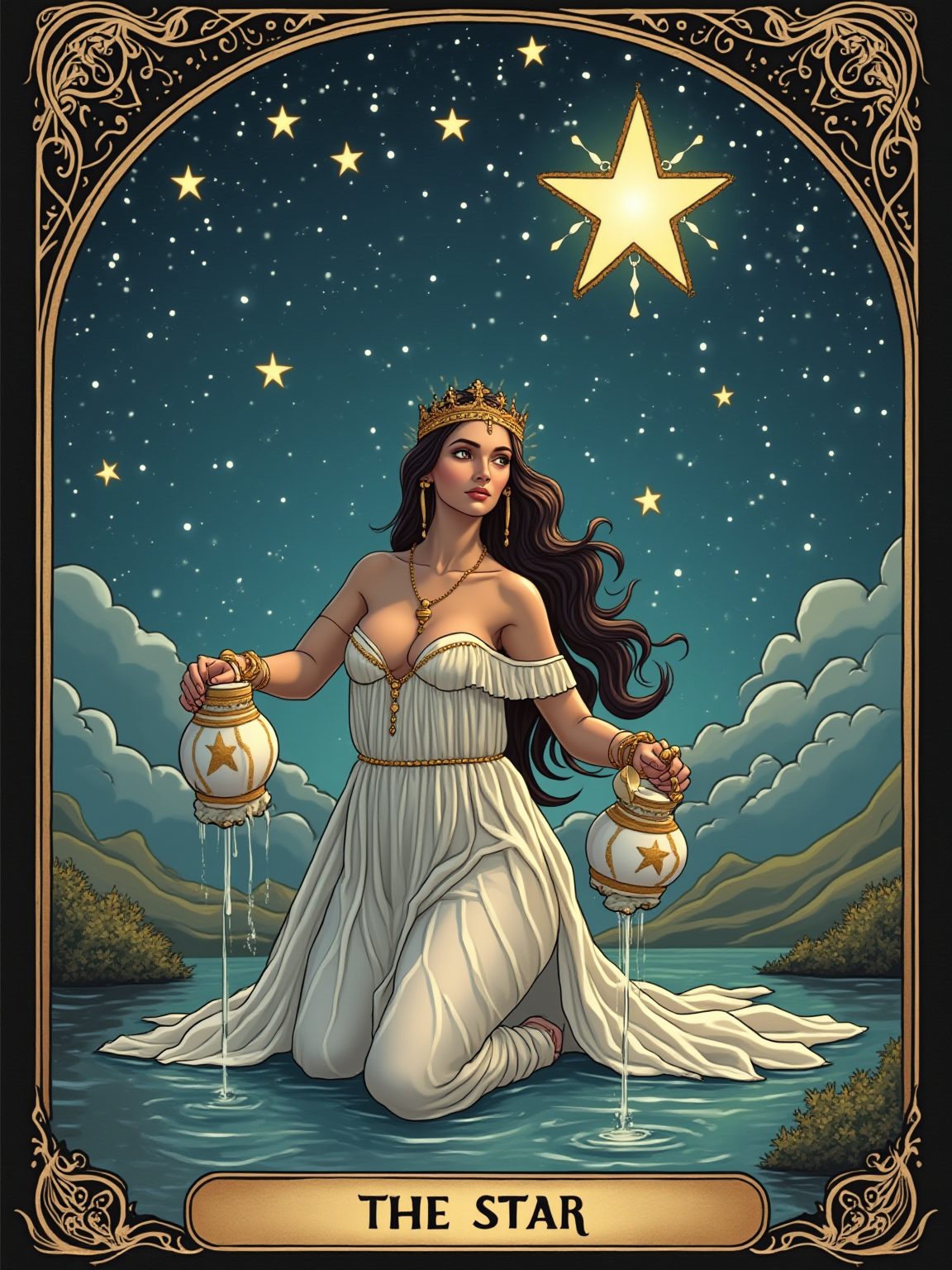 Tarot Card of The Star featuring model wearing flowing ethereal gown with star jewelry and celestial crown , kneeling by water, pouring water from two jugs, seven stars in night sky above, one large star prominent, hopeful serene expression, mystical landscape