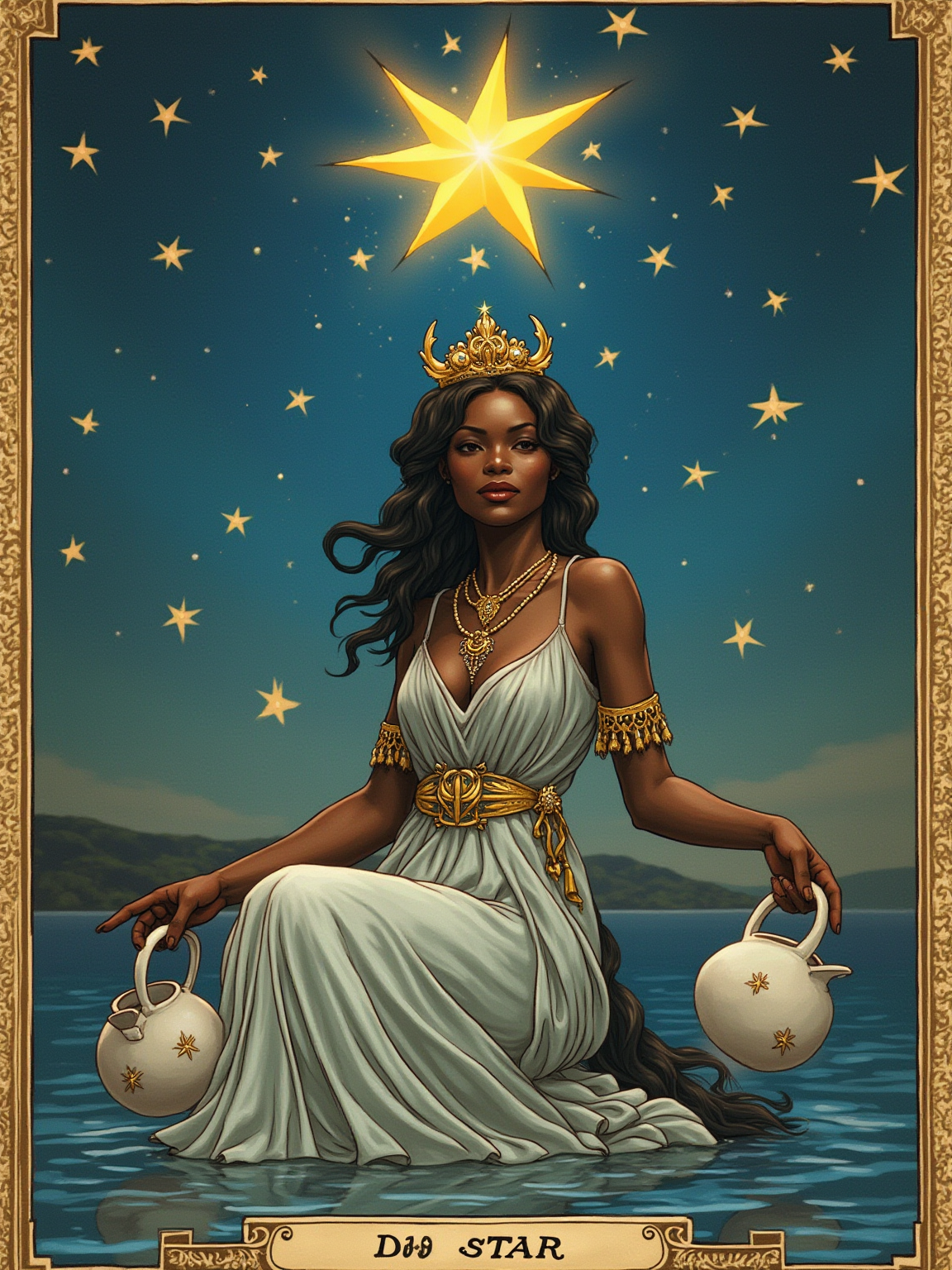 Tarot Card of The Star featuring model wearing flowing ethereal gown with star jewelry and celestial crown , kneeling by water, pouring water from two jugs, seven stars in night sky above, one large star prominent, hopeful serene expression, mystical landscape