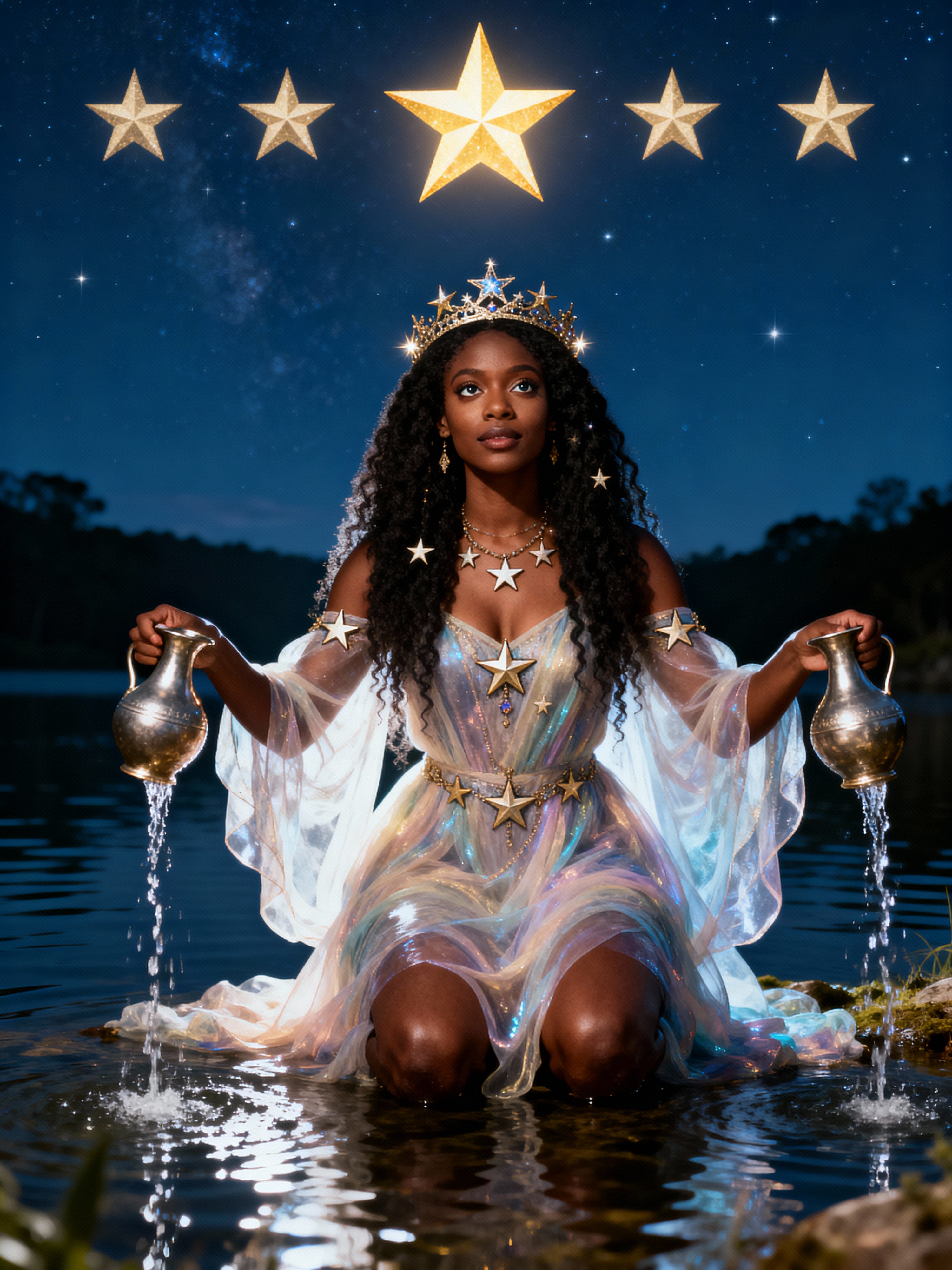 Tarot Card of The Star featuring model wearing flowing ethereal gown with star jewelry and celestial crown , kneeling by water, pouring water from two jugs, seven stars in night sky above, one large star prominent, hopeful serene expression, mystical landscape