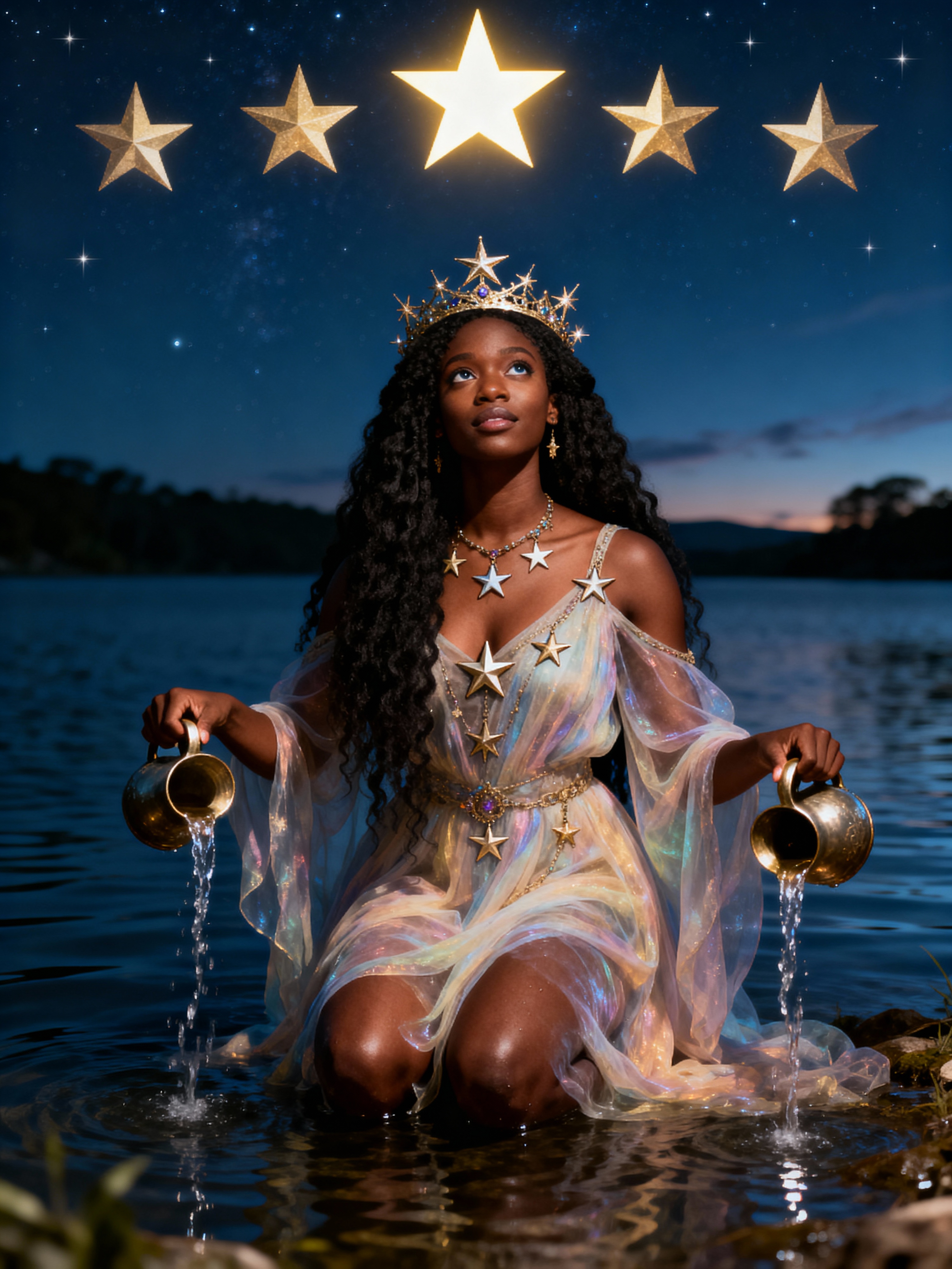 Tarot Card of The Star featuring model wearing flowing ethereal gown with star jewelry and celestial crown , kneeling by water, pouring water from two jugs, seven stars in night sky above, one large star prominent, hopeful serene expression, mystical landscape