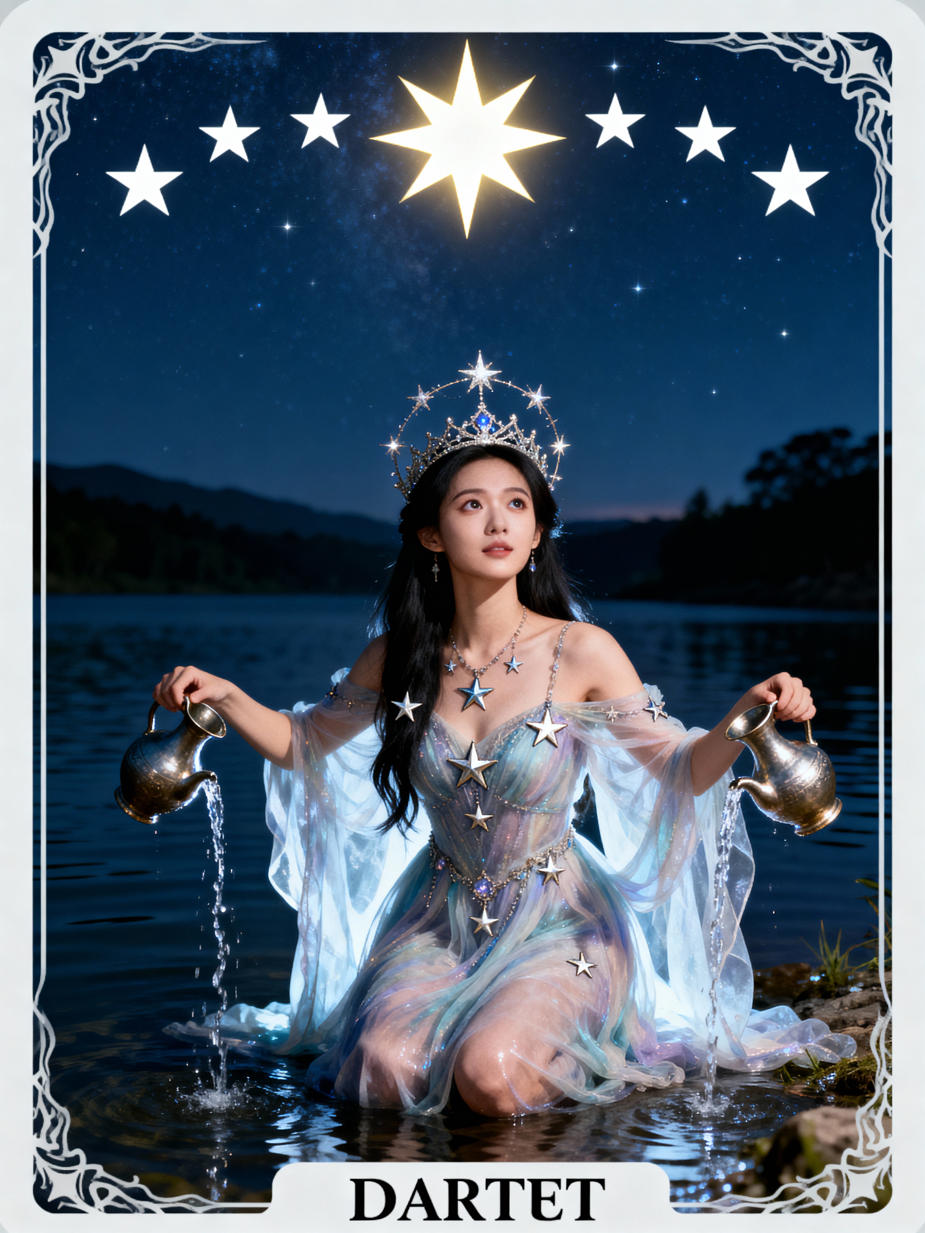 Tarot Card of The Star featuring model wearing flowing ethereal gown with star jewelry and celestial crown , kneeling by water, pouring water from two jugs, seven stars in night sky above, one large star prominent, hopeful serene expression, mystical landscape