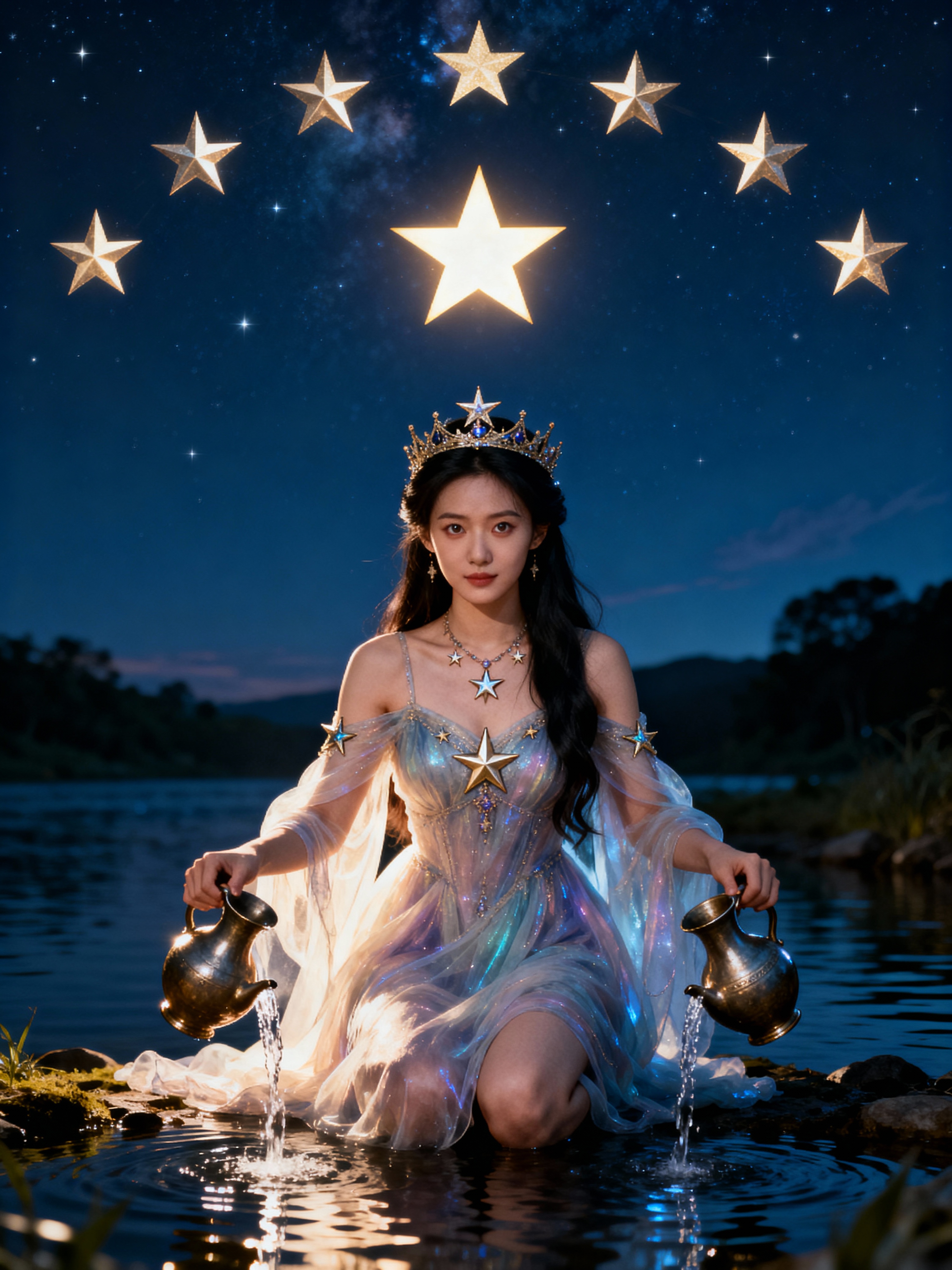 Tarot Card of The Star featuring model wearing flowing ethereal gown with star jewelry and celestial crown , kneeling by water, pouring water from two jugs, seven stars in night sky above, one large star prominent, hopeful serene expression, mystical landscape
