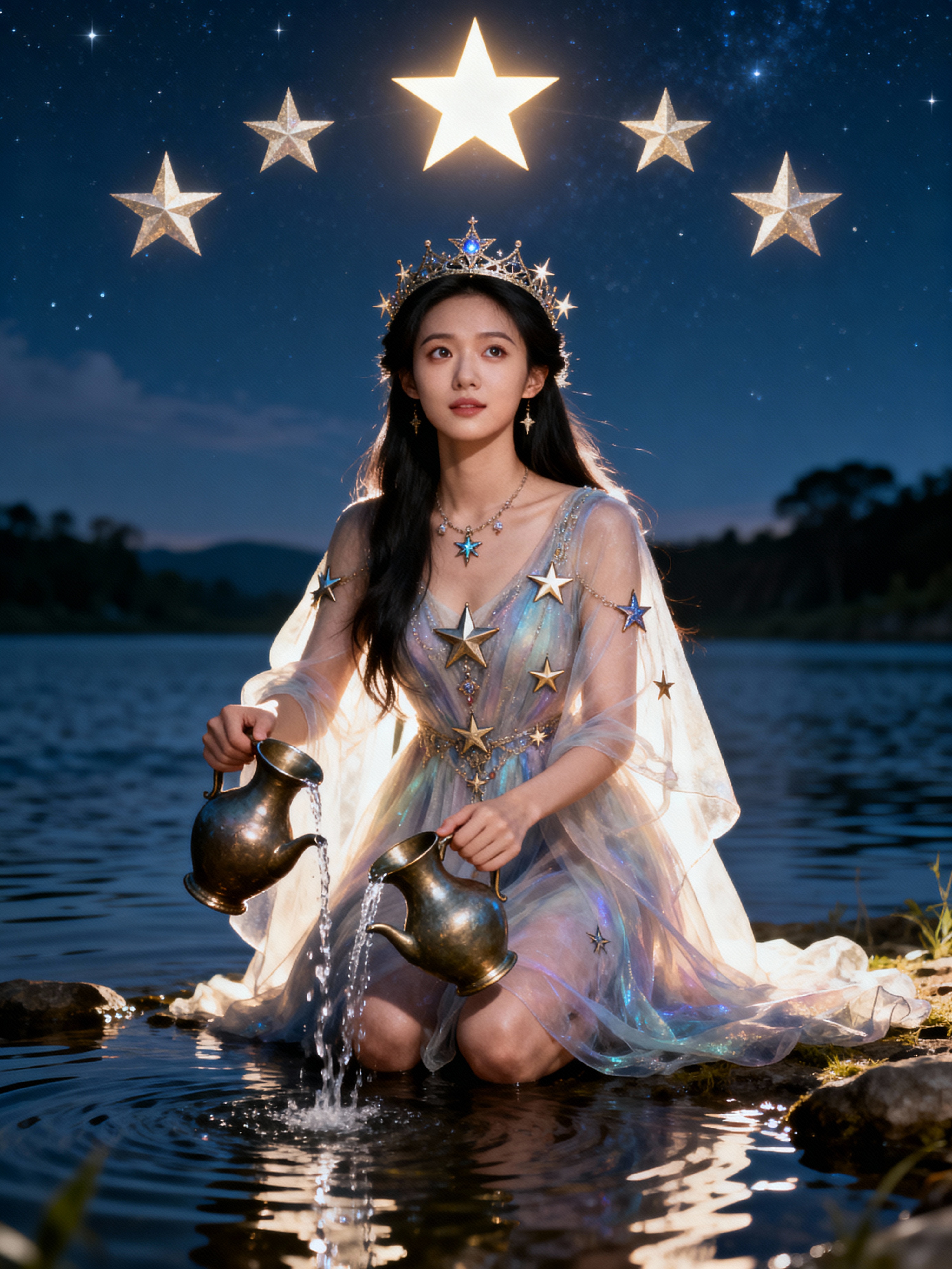 Tarot Card of The Star featuring model wearing flowing ethereal gown with star jewelry and celestial crown , kneeling by water, pouring water from two jugs, seven stars in night sky above, one large star prominent, hopeful serene expression, mystical landscape