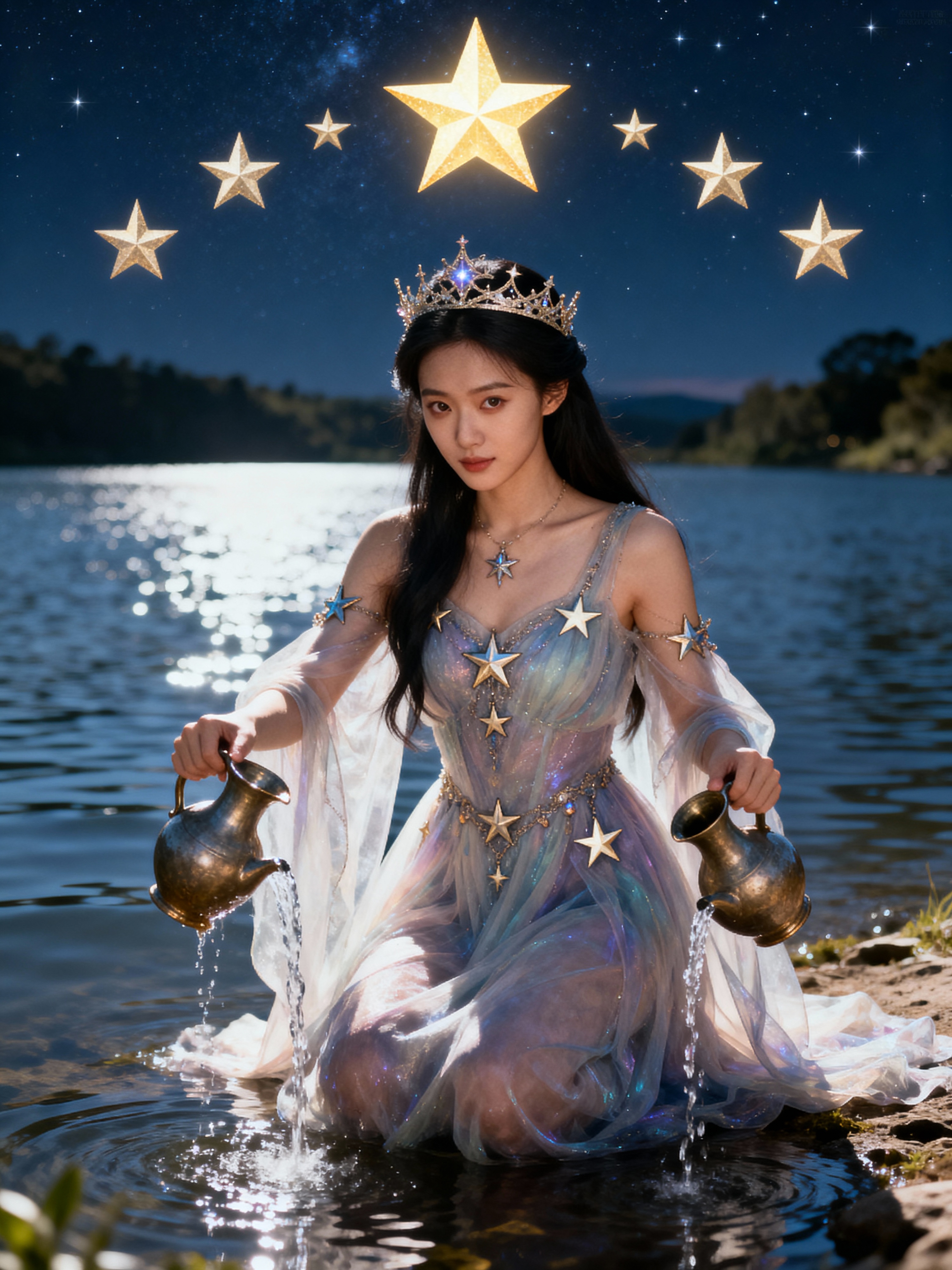 Tarot Card of The Star featuring model wearing flowing ethereal gown with star jewelry and celestial crown , kneeling by water, pouring water from two jugs, seven stars in night sky above, one large star prominent, hopeful serene expression, mystical landscape