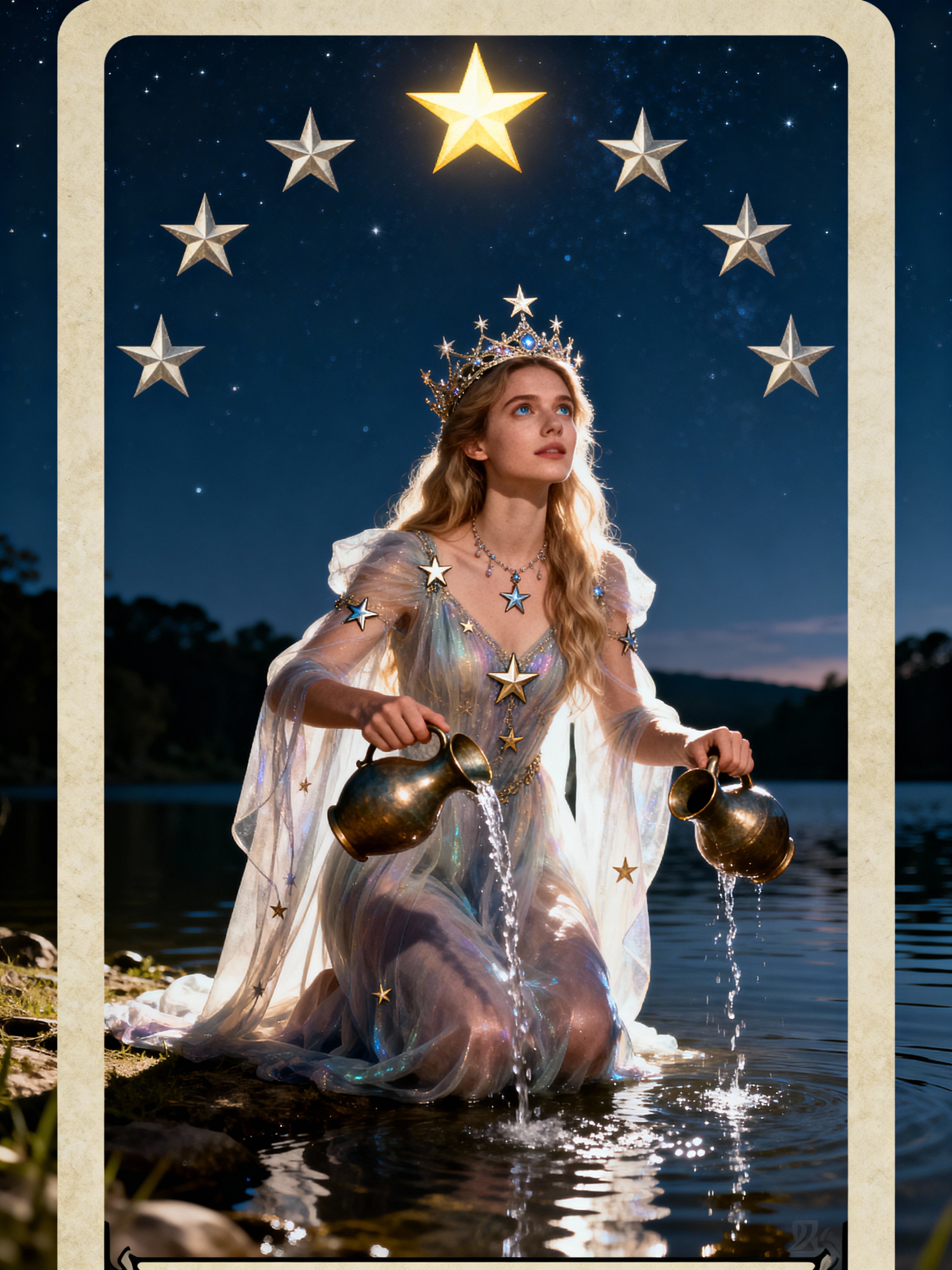Tarot Card of The Star featuring model wearing flowing ethereal gown with star jewelry and celestial crown , kneeling by water, pouring water from two jugs, seven stars in night sky above, one large star prominent, hopeful serene expression, mystical landscape