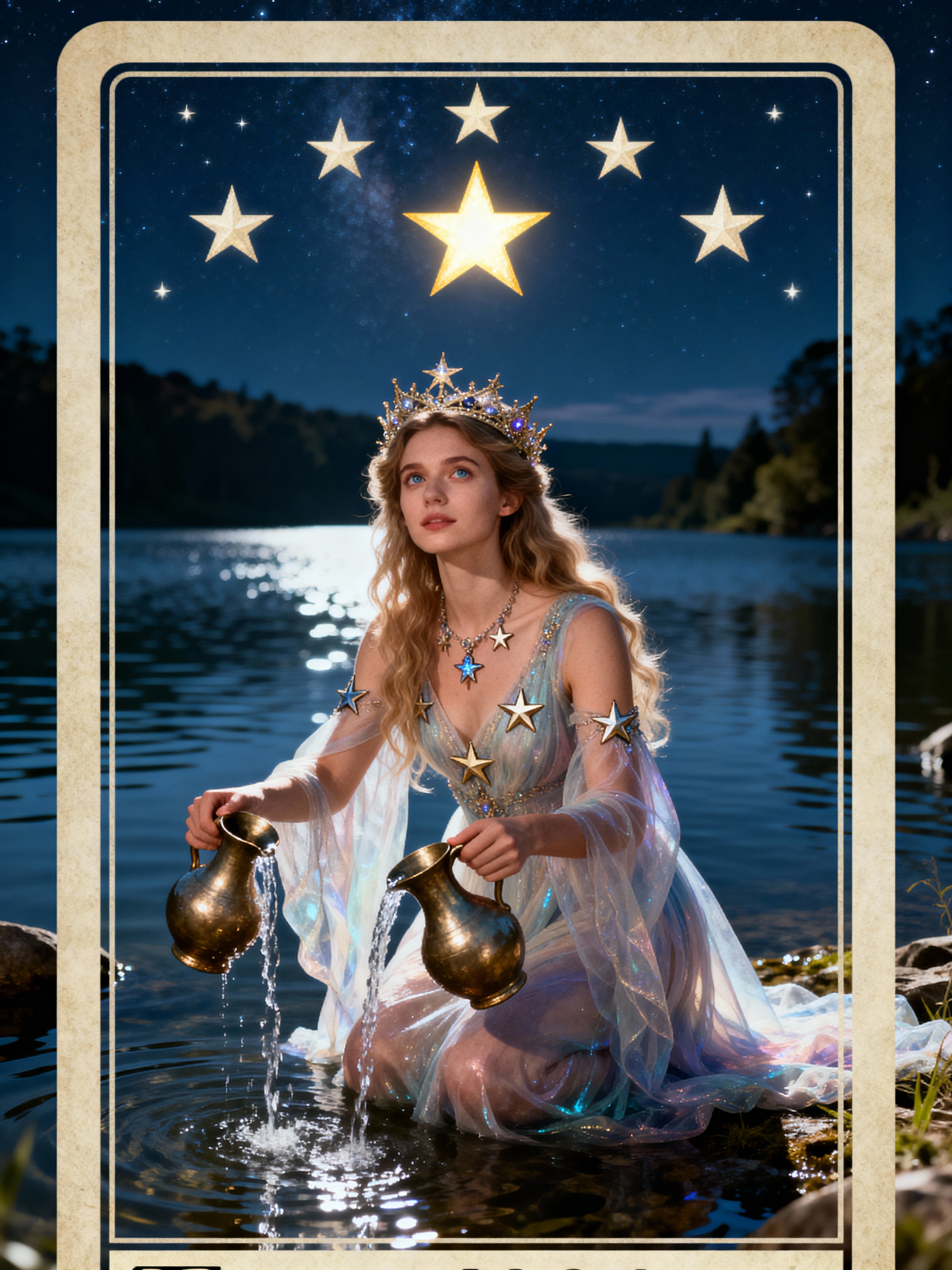 Tarot Card of The Star featuring model wearing flowing ethereal gown with star jewelry and celestial crown , kneeling by water, pouring water from two jugs, seven stars in night sky above, one large star prominent, hopeful serene expression, mystical landscape