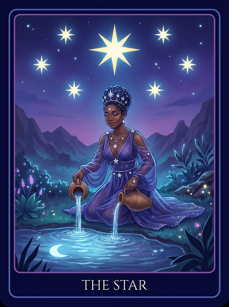 Tarot Card of The Star featuring model wearing flowing ethereal gown with star jewelry and celestial crown , kneeling by water, pouring water from two jugs, seven stars in night sky above, one large star prominent, hopeful serene expression, mystical landscape
