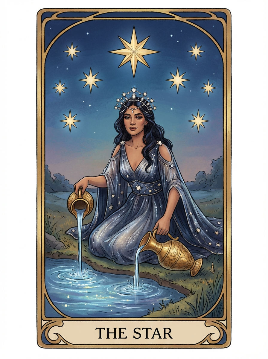 Tarot Card of The Star featuring model wearing flowing ethereal gown with star jewelry and celestial crown , kneeling by water, pouring water from two jugs, seven stars in night sky above, one large star prominent, hopeful serene expression, mystical landscape