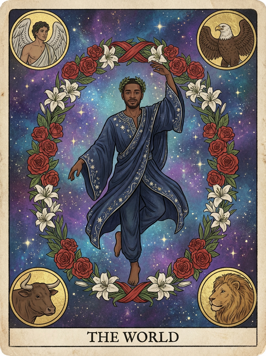 Tarot Card of The World featuring model wearing celestial robes with laurel wreath crown, dancing pose within oval wreath of flowers, four corners showing angel, eagle, lion, and bull symbols, cosmic background with stars, expression of completion and fulfillment