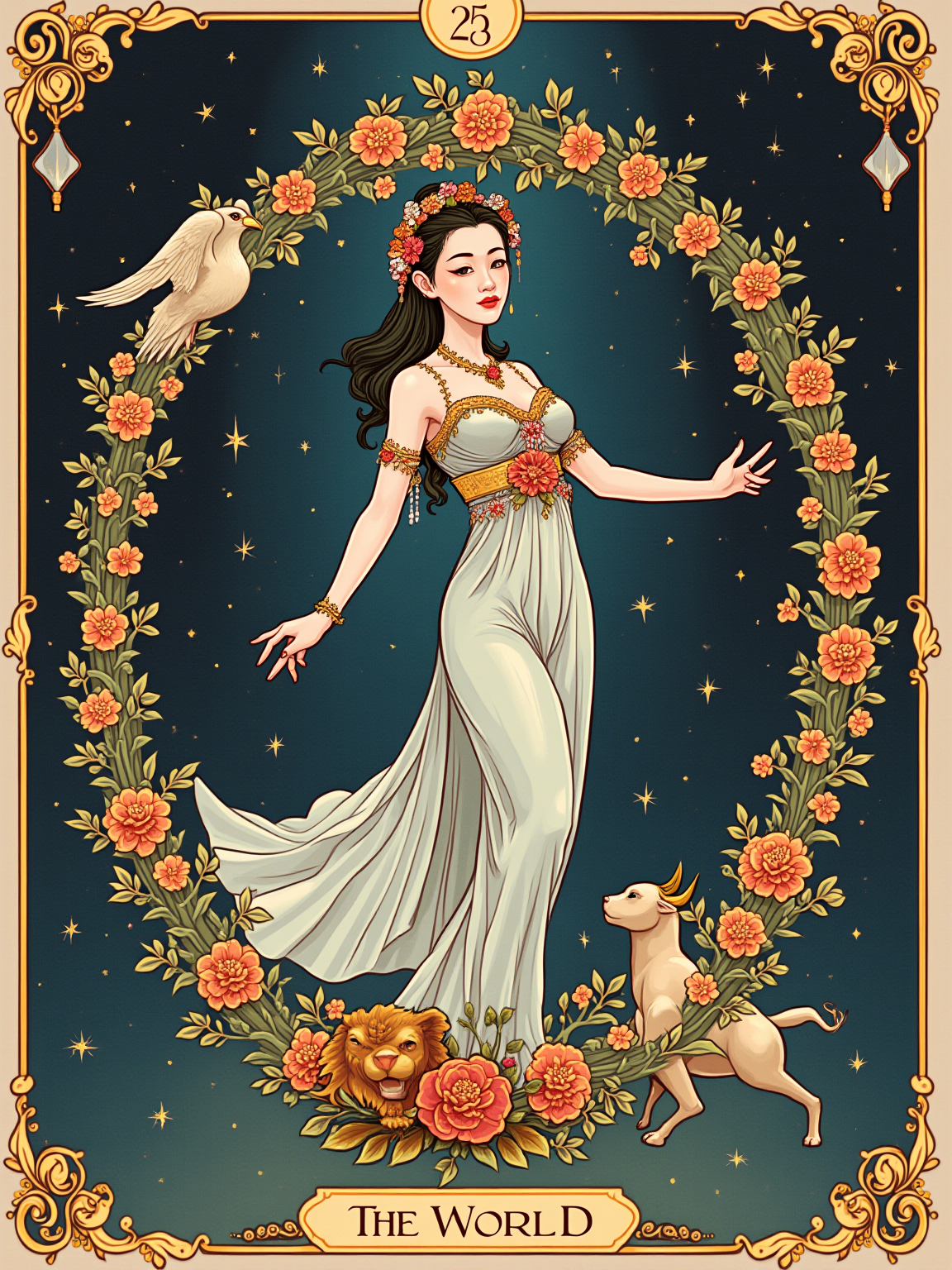 Tarot Card of The World featuring model wearing flowing cosmic dress with laurel wreath crown , dancing pose within oval wreath of flowers, four corners showing angel, eagle, lion, and bull symbols, cosmic background with stars, expression of completion and fulfillment