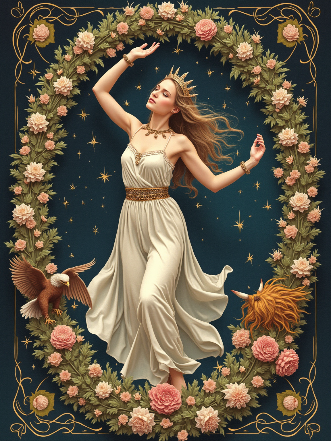 Tarot Card of The World featuring model wearing flowing cosmic dress with laurel wreath crown , dancing pose within oval wreath of flowers, four corners showing angel, eagle, lion, and bull symbols, cosmic background with stars, expression of completion and fulfillment
