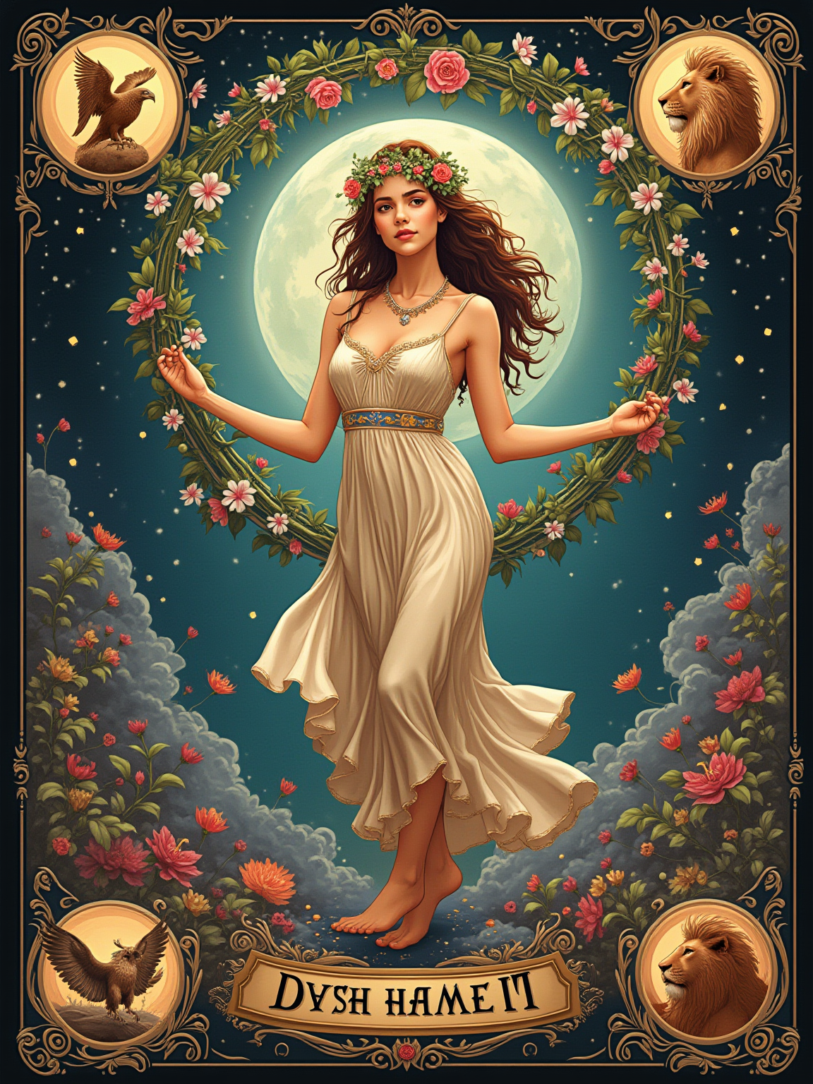 Tarot Card of The World featuring model wearing flowing cosmic dress with laurel wreath crown , dancing pose within oval wreath of flowers, four corners showing angel, eagle, lion, and bull symbols, cosmic background with stars, expression of completion and fulfillment