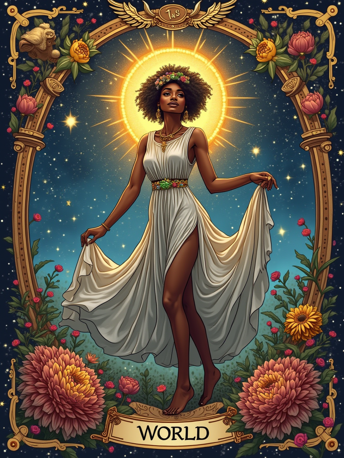Tarot Card of The World featuring model wearing flowing cosmic dress with laurel wreath crown , dancing pose within oval wreath of flowers, four corners showing angel, eagle, lion, and bull symbols, cosmic background with stars, expression of completion and fulfillment