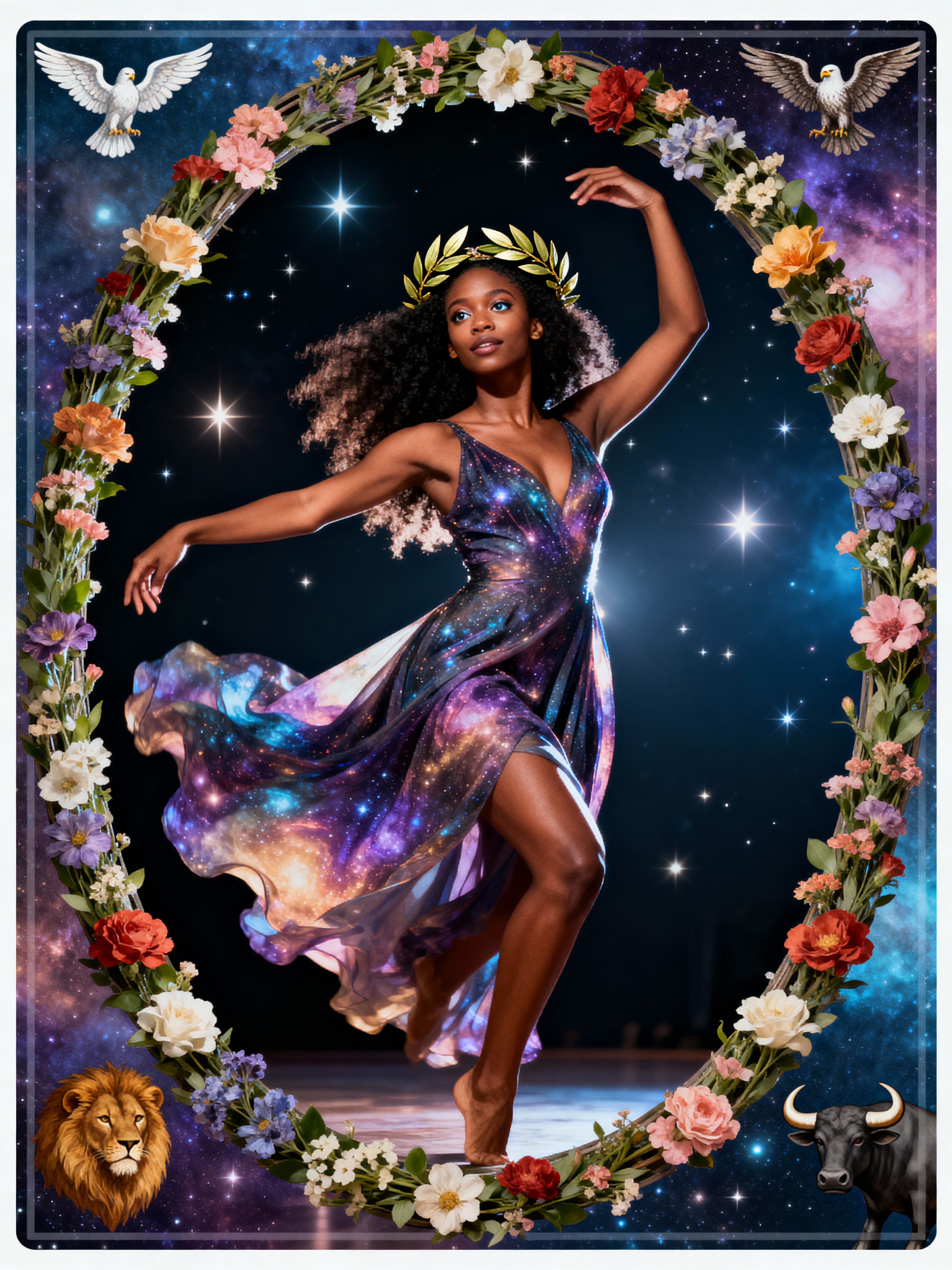 Tarot Card of The World featuring model wearing flowing cosmic dress with laurel wreath crown , dancing pose within oval wreath of flowers, four corners showing angel, eagle, lion, and bull symbols, cosmic background with stars, expression of completion and fulfillment