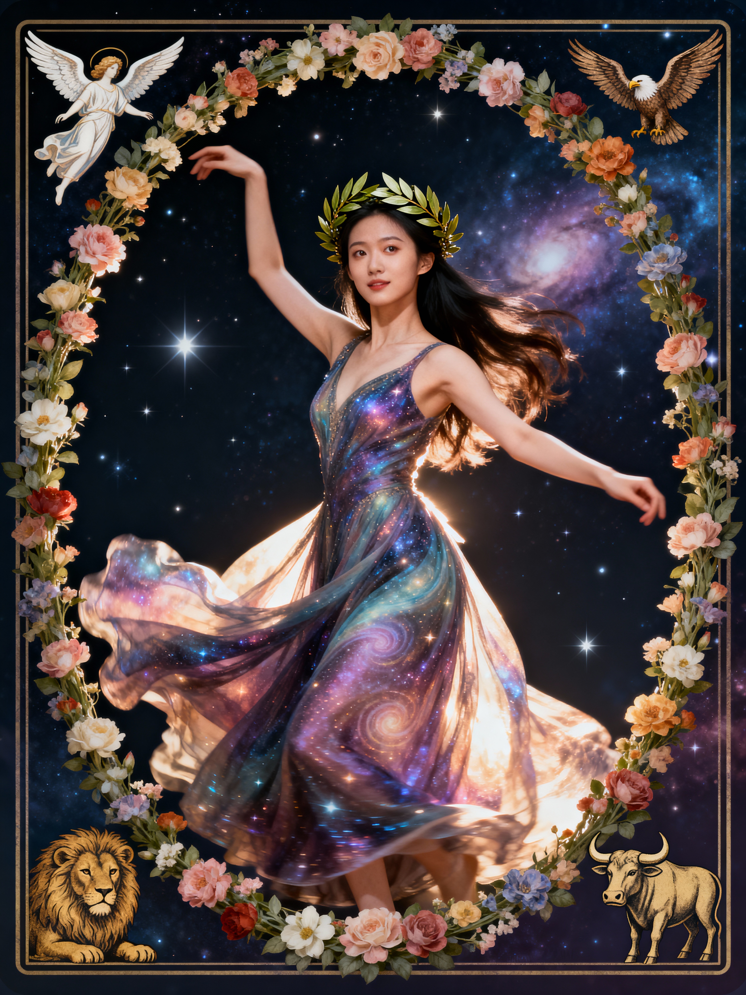 Tarot Card of The World featuring model wearing flowing cosmic dress with laurel wreath crown , dancing pose within oval wreath of flowers, four corners showing angel, eagle, lion, and bull symbols, cosmic background with stars, expression of completion and fulfillment