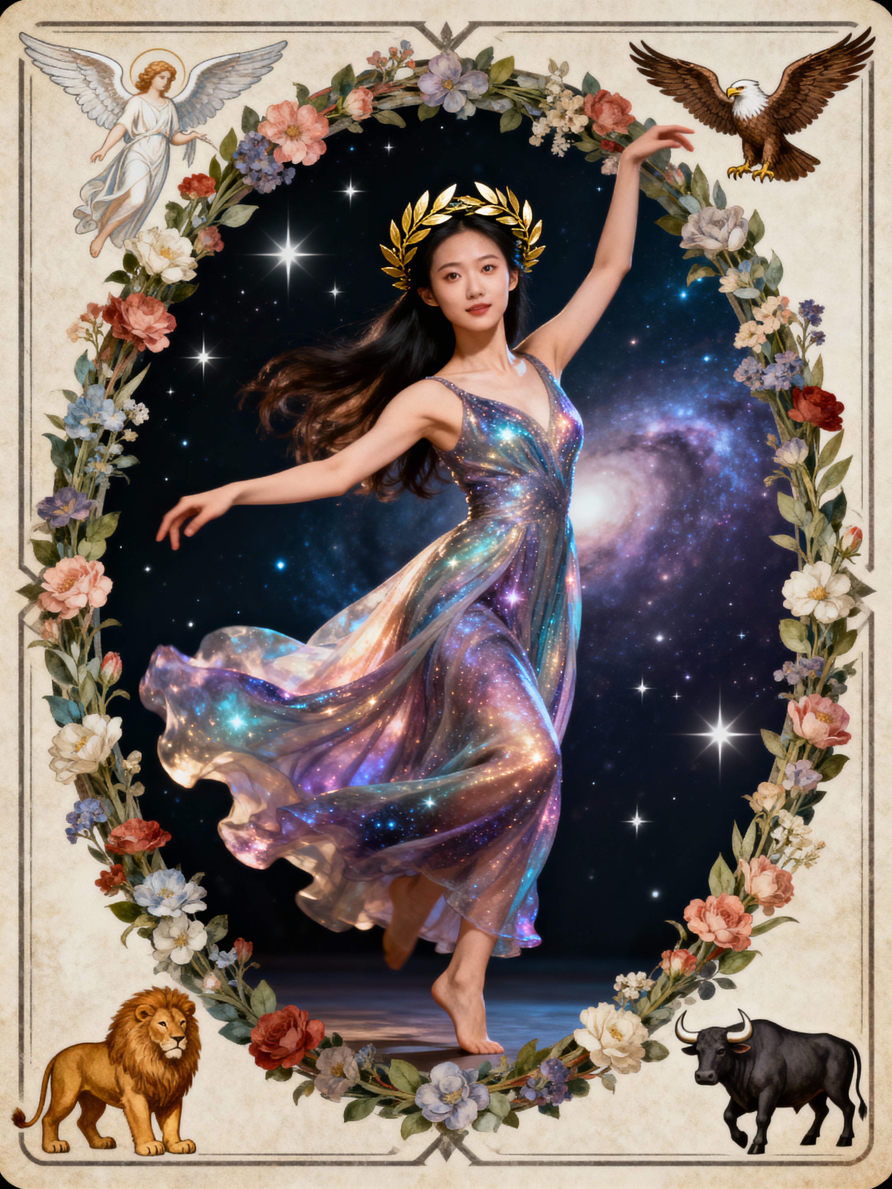 Tarot Card of The World featuring model wearing flowing cosmic dress with laurel wreath crown , dancing pose within oval wreath of flowers, four corners showing angel, eagle, lion, and bull symbols, cosmic background with stars, expression of completion and fulfillment