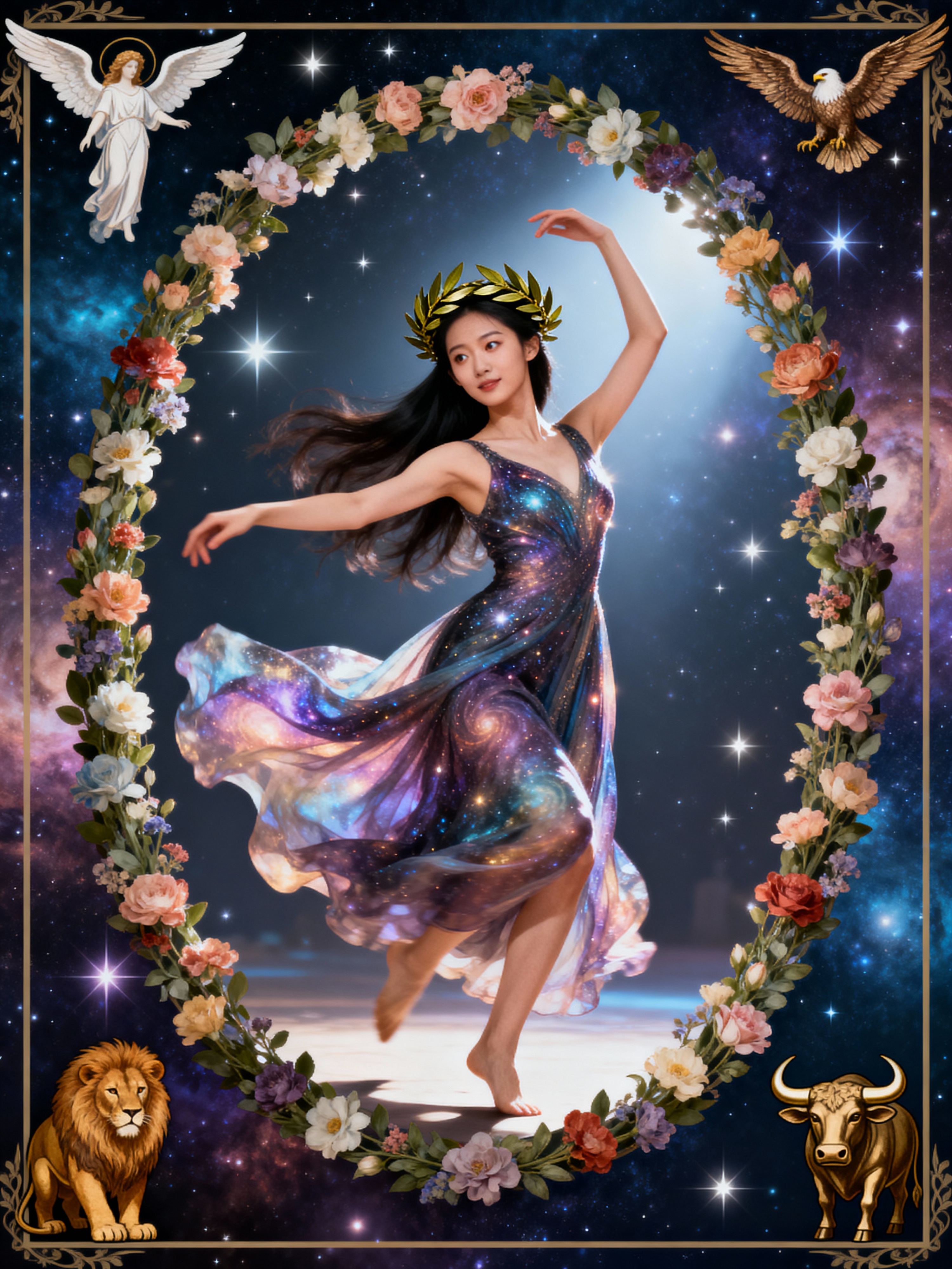 Tarot Card of The World featuring model wearing flowing cosmic dress with laurel wreath crown , dancing pose within oval wreath of flowers, four corners showing angel, eagle, lion, and bull symbols, cosmic background with stars, expression of completion and fulfillment