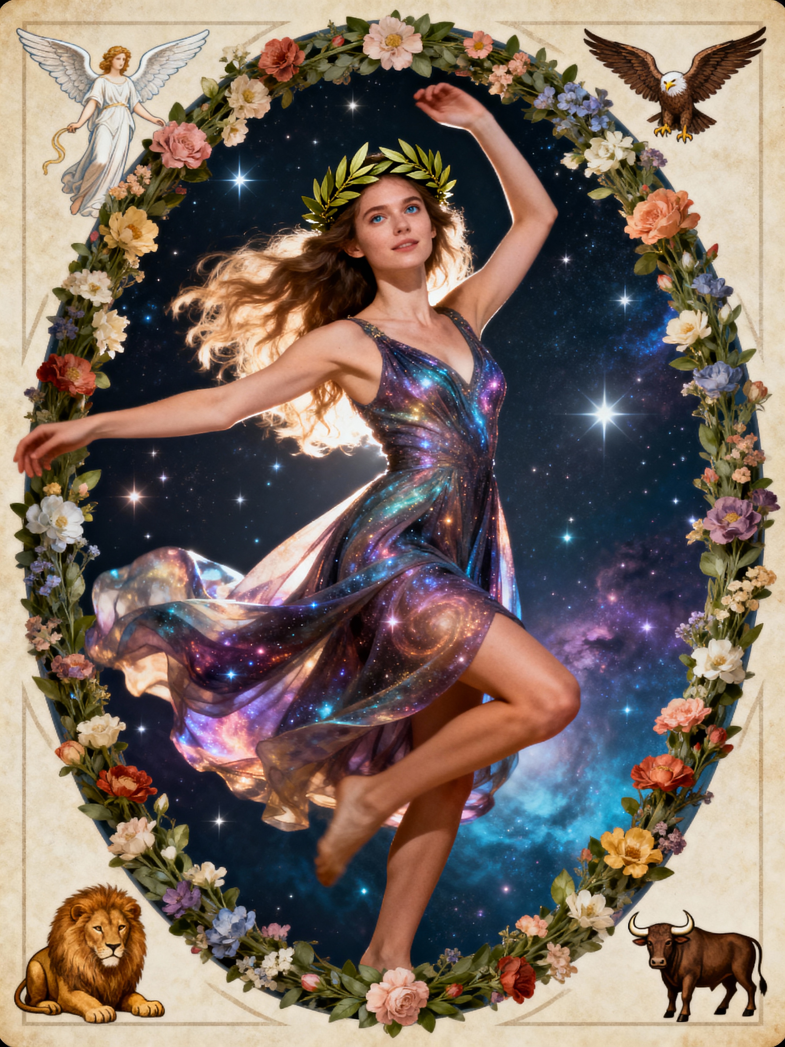 Tarot Card of The World featuring model wearing flowing cosmic dress with laurel wreath crown , dancing pose within oval wreath of flowers, four corners showing angel, eagle, lion, and bull symbols, cosmic background with stars, expression of completion and fulfillment