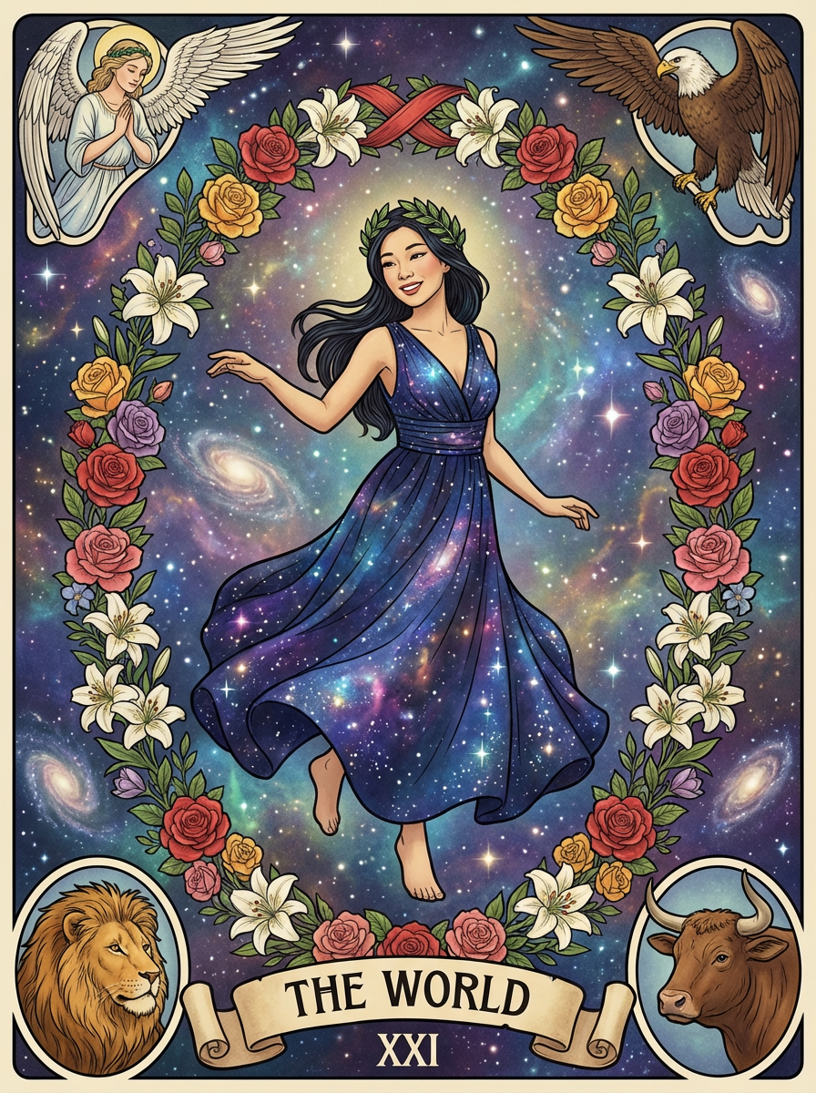 Tarot Card of The World featuring model wearing flowing cosmic dress with laurel wreath crown , dancing pose within oval wreath of flowers, four corners showing angel, eagle, lion, and bull symbols, cosmic background with stars, expression of completion and fulfillment