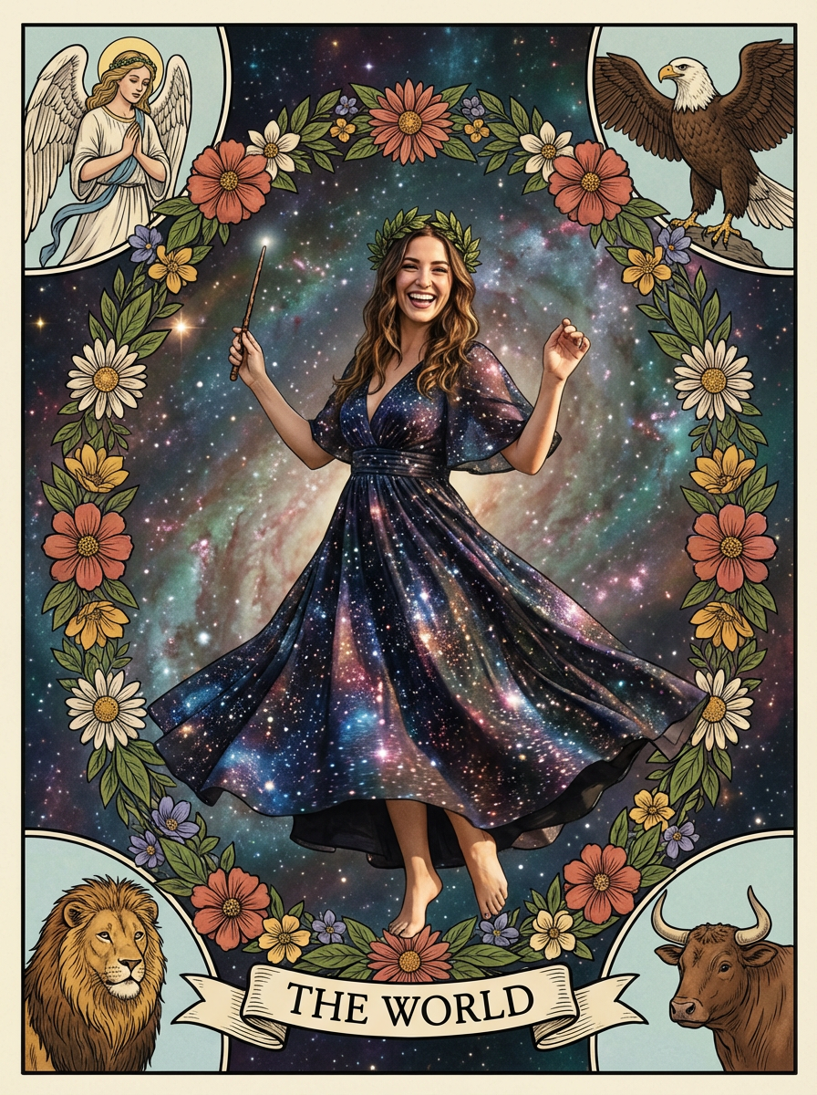 Tarot Card of The World featuring model wearing flowing cosmic dress with laurel wreath crown , dancing pose within oval wreath of flowers, four corners showing angel, eagle, lion, and bull symbols, cosmic background with stars, expression of completion and fulfillment