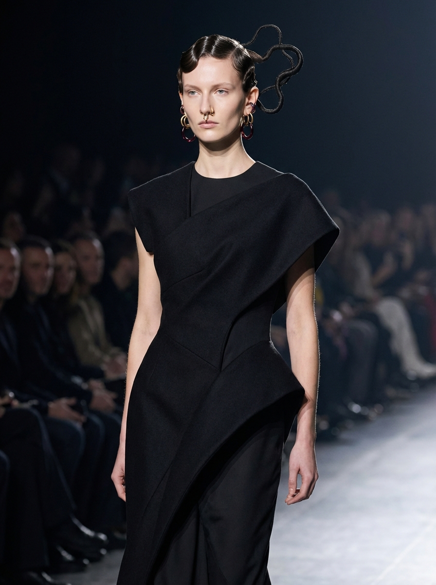 {"task": "avant_garde_high_fashion_runway_portrait", "output": {"type": "single_image", "resolution": "ultra_high_resolution_8k", "realism": "extreme_photorealism", "quality": "museum_level_fashion_editorial", "retouching": {"enhanced_skin": true, "natural_skin_texture": true, "visible_pores": true, "no_plastic_look": true}}, "subject": {"gender": "model", "age_range": "early_20s", "pose": "three_quarter_profile", "expression": "serene_detached_runway_presence", "gaze": "forward_slightly_down", "skin": "porcelain_fair", "makeup": {"base": "clean_matte_skin", "eyes": "soft_shadow_or_bare", "lips": "muted_natural_tone", "details": "subtle_editorial_sculptural_accents"}}, "hair": {"front": {"style": "ultra_sculpted_baby_hairs", "pattern": "precise_graphic_waves", "finish": "glossy_controlled", "note": "front_hair_preserved"}, "back": {"style": "avant_garde_structural_hair_form", "description": "abstract_twisted_or_folded_hair_structure_extending_outward", "variation": "no_bun_no_braid", "finish": "sleek_with_subtle_texture_contrast"}}, "jewelry": {"concept": "jewelry_as_sculptural_body_art", "ear": "multiple_piercings_with_gold_and_deep_garnet_elements", "nose": "ornamental_gold_nose_piece", "design_style": "avant_garde_fine_jewelry_meets_couture", "finish": "polished_gold_with_dark_red_stones"}, "wardrobe": {"style": "avant_garde_couture", "garment": "experimental_runway_piece", "silhouette": "architectural_and_sculptural", "details": ["asymmetrical_volumes", "layered_textiles", "sharp_and_soft_forms_combined"], "fabric": "structured_wool_blend_with_couture_finishing", "color_palette": ["deep_black", "charcoal", "subtle_dark_metallic_accents"]}, "lighting": {"type": "dramatic_runway_lighting", "key_light": "directional_side_light", "contrast": "high", "highlights": "controlled_gloss_on_hair_and_jewelry", "shadows": "deep_editorial_shadows"}, "camera": {"shot_type": "editorial_close_up", "angle": "slightly_below_eye_level", "lens": "85mm_fashion_portrait", "aperture": "f1.8", "depth_of_field": "shallow_with_soft_runway_background"}, "environment": {"setting": "high_fashion_runway", "background": "dark_blurred_audience", "atmosphere": "intimate_couture_moment"}, "aesthetic_keywords": ["avant_garde", "couture_runway", "sculptural_fashion", "editorial_elegance", "high_concept_beauty"], "negative_prompt": ["bun_hairstyle", "braids _at_back", "casual_clothing", "streetwear", "smiling", "overdone_makeup", "plastic_skin", "low_resolution"]}