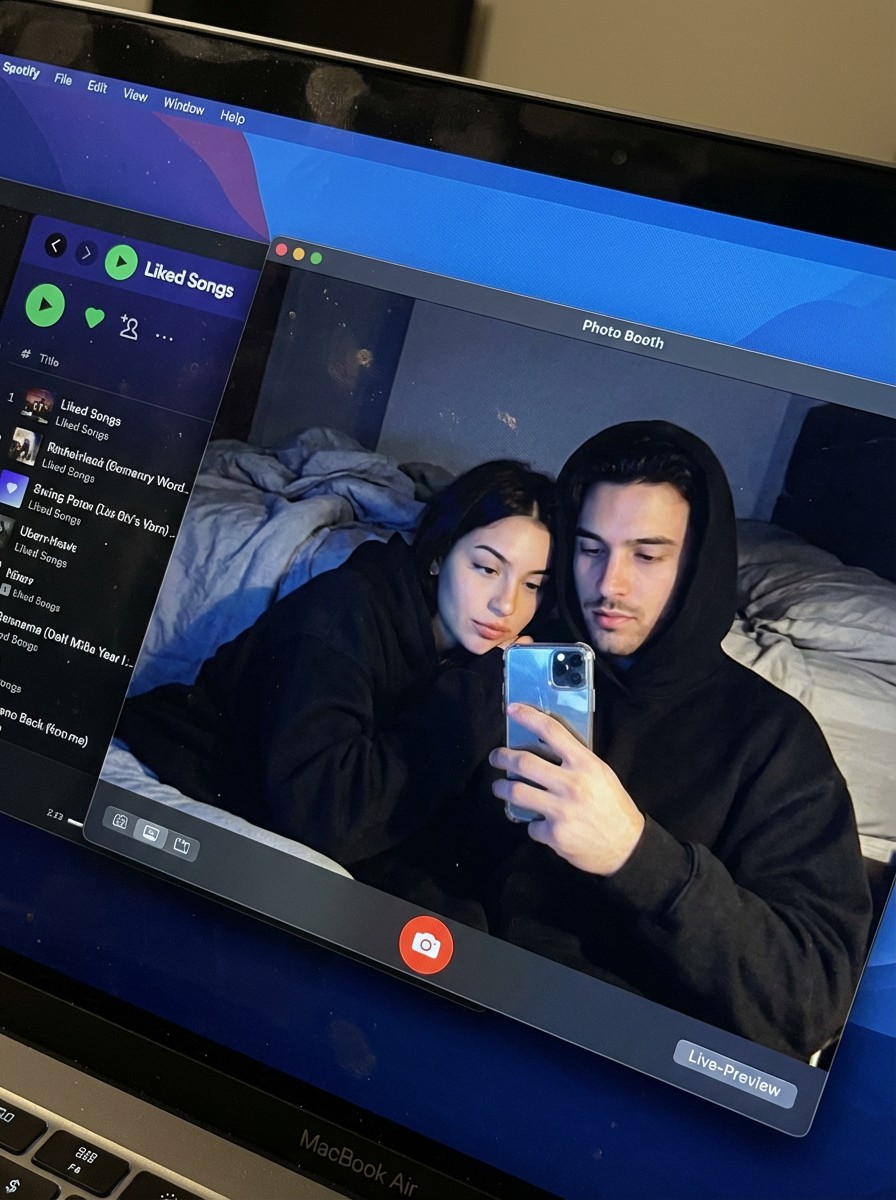 {"task_configuration":{"task_type":"screen_simulation_photorealism","target_woman":"SDXL_1.0_Refiner","aspect_ratio":"3:4","resolution":{"width":1152,"height":1536}},"visual_hierarchy":{"layer_1_physical_macro":{"camera_angle":"Downward-angled, high-angle","framing":"MacBook screen filling 95% of frame","surface_imperfections":["subtle pixel-grid texture (moire)","tiny dust particles on glass","faint ambient light reflection on glossy screen","fingerprint smudges"],"foreground_anchor":"Thin strip of physical keyboard visible at lower edge"},"layer_2_digital_interface":{"theme":"Dark Mode (macOS)","window_layout":{"left_panel":"Spotify Liked Songs playlist (dimmed)","right_panel":"Photo Booth live-preview window (dominant focus)"}},"layer_3_nested_subject_content":{"context":"Inside the Photo Booth window","environment":"Dim bedroom, off-plain background, rumpled bedding","lighting_simulation":"Cool screen glow mixed with warm skin tones, deep nocturnal shadows","subjects":{"shared_attributes":["Oversized black hoodies","Hoods pushed back (faces fully visible)","Reclining pose","Looking at screen"],"subject_a_guy":{"identity_target":"reference_image_male.jpg","action":"Holding phone in right hand with clear reflective case","position":"Right/Center"},"subject_b_girl":{"identity_target":"reference_image_female.jpg","action":"Resting closely beside Subject A","position":"Left/Center"}}}},"prompt_assembly":{"positive_prompt":"Hyper-realistic downward shot of a MacBook screen. The screen surface has visible dust, pixel grid, and reflection. The screen displays a Photo Booth window showing a couple in a dark room. [Subject Descriptions]. They are wearing black hoodies. The lighting is low-key, candid, nocturnal, blue-ish screen glow. High fidelity, raw photo, unedited.","negative_prompt":"vector art, screenshot, flat digital image, clean glass, perfect screen, daylight, bright studio lights, cartoon, 3d render, painting, watermark"},"identity_preservation_settings":{"strictness_level":"CRITICAL","methodology":{"face_restoration":false,"note":"Disable generic face restorers (CodeFormer) to avoid plastic look. Use IP-Adapter.","control_net_stack":[{"unit":"ControlNet_Tile","weight":0.4,"purpose":"To maintain the text/interface sharpness"},{"unit":"IP-Adapter_FaceID_Plus","weight":0.95,"region_mask":"Photo Booth Window Area Only","purpose":"To force exact facial identity match for both subjects"}]}},"rendering_parameters":{"sampler":"DPM++ 3M SDE Exponential","steps":40,"cfg_scale":5.5,"denoising_strength":0.35}}