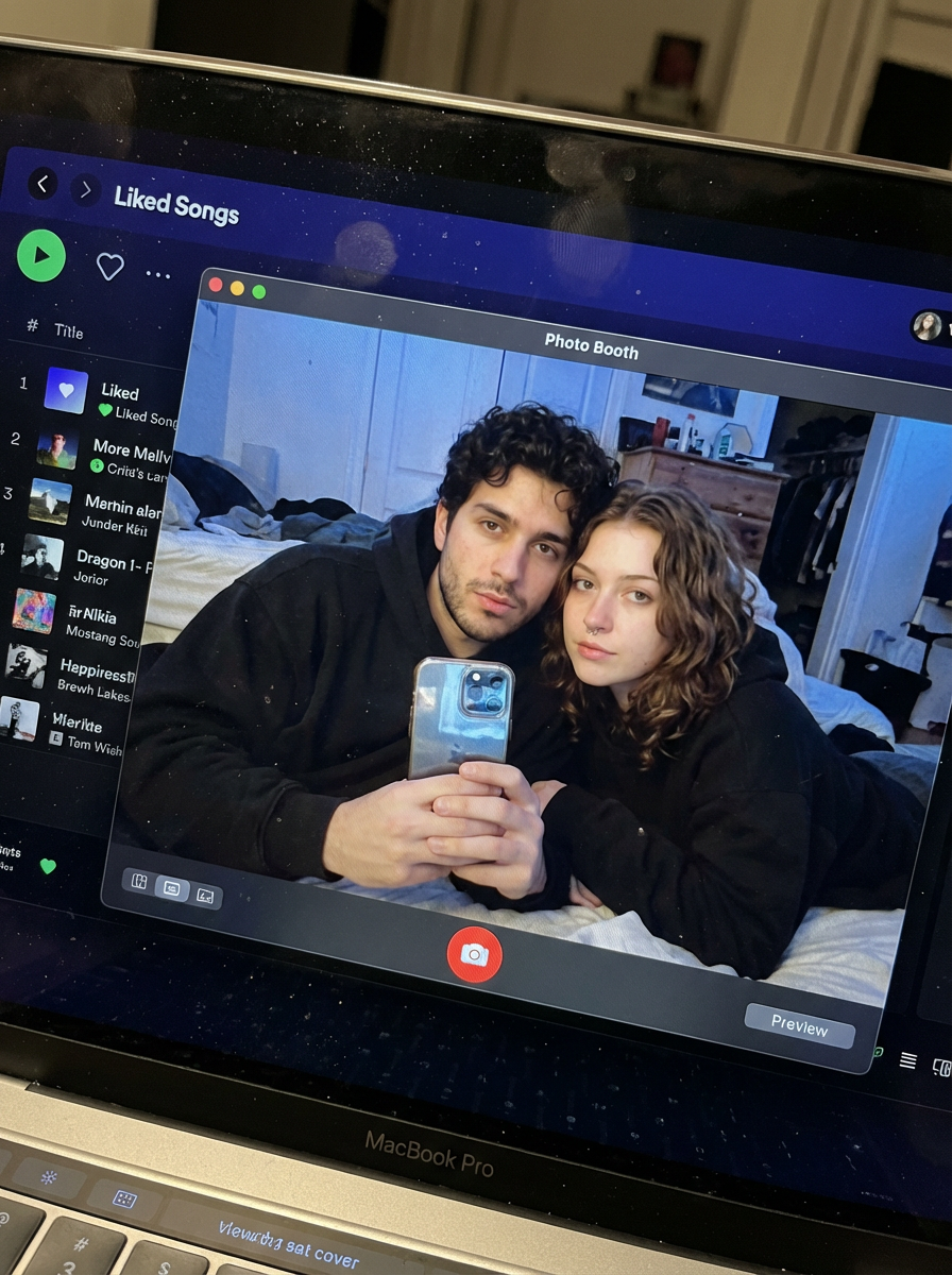 {"task_configuration":{"task_type":"screen_simulation_photorealism","target_woman":"SDXL_1.0_Refiner","aspect_ratio":"3:4","resolution":{"width":1152,"height":1536}},"visual_hierarchy":{"layer_1_physical_macro":{"camera_angle":"Downward-angled, high-angle","framing":"MacBook screen filling 95% of frame","surface_imperfections":["subtle pixel-grid texture (moire)","tiny dust particles on glass","faint ambient light reflection on glossy screen","fingerprint smudges"],"foreground_anchor":"Thin strip of physical keyboard visible at lower edge"},"layer_2_digital_interface":{"theme":"Dark Mode (macOS)","window_layout":{"left_panel":"Spotify Liked Songs playlist (dimmed)","right_panel":"Photo Booth live-preview window (dominant focus)"}},"layer_3_nested_subject_content":{"context":"Inside the Photo Booth window","environment":"Dim bedroom, off-plain background, rumpled bedding","lighting_simulation":"Cool screen glow mixed with warm skin tones, deep nocturnal shadows","subjects":{"shared_attributes":["Oversized black hoodies","Hoods pushed back (faces fully visible)","Reclining pose","Looking at screen"],"subject_a_guy":{"identity_target":"reference_image_male.jpg","action":"Holding phone in right hand with clear reflective case","position":"Right/Center"},"subject_b_girl":{"identity_target":"reference_image_female.jpg","action":"Resting closely beside Subject A","position":"Left/Center"}}}},"prompt_assembly":{"positive_prompt":"Hyper-realistic downward shot of a MacBook screen. The screen surface has visible dust, pixel grid, and reflection. The screen displays a Photo Booth window showing a couple in a dark room. [Subject Descriptions]. They are wearing black hoodies. The lighting is low-key, candid, nocturnal, blue-ish screen glow. High fidelity, raw photo, unedited.","negative_prompt":"vector art, screenshot, flat digital image, clean glass, perfect screen, daylight, bright studio lights, cartoon, 3d render, painting, watermark"},"identity_preservation_settings":{"strictness_level":"CRITICAL","methodology":{"face_restoration":false,"note":"Disable generic face restorers (CodeFormer) to avoid plastic look. Use IP-Adapter.","control_net_stack":[{"unit":"ControlNet_Tile","weight":0.4,"purpose":"To maintain the text/interface sharpness"},{"unit":"IP-Adapter_FaceID_Plus","weight":0.95,"region_mask":"Photo Booth Window Area Only","purpose":"To force exact facial identity match for both subjects"}]}},"rendering_parameters":{"sampler":"DPM++ 3M SDE Exponential","steps":40,"cfg_scale":5.5,"denoising_strength":0.35}}