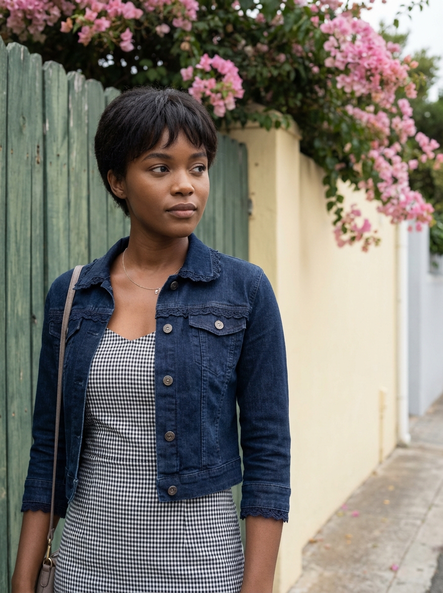 {"task": "create_image", "facelock_identity": true, "identity_accuracy": "100%", "quality": "ultra-realistic 8k fashion photography", "subject": {"gender": "model", "age": "young adult", "expression": "elegant, introspective, natural, effortless confidence", "pose": "medium portrait, upper body visible, body slightly angled, head turned to the side, relaxed candid posture", "skin": {"texture": "natural, detailed, realistic pores", "tone": "even, soft, healthy"}, "hair": {"style": "short hair", hair, "details": "soft bangs"}}, "outfit": {"outerwear": "cropped navy denim jacket, casual fit, realistic fabric folds and texture, lace trim and embroidery small ribbon", "innerwear": "checkered black-and-camisole slimfit dress, thick fabric texture", "accessories": "subtle minimalist necklace, shoulder bag strap visible"}, "environment": {"location": "outdoor urban residential street", "background": "green wooden fence, pale yellow wall, lush greenery, pink bougainvillea flowers", "details": "layered background depth with foliage framing the subject naturally"}, "composition": {"framing": "rule of thirds, subject slightly off-center", "camera_angle": "eye-level", "lens": "35mm–50mm equivalent", "depth_of_field": "moderate depth, subject sharp with softly detailed background separation"}, "lighting": {"type": "natural daylight", "quality": "soft, diffused, overcast-like", "effect": "gentle highlights, minimal shadows, flattering facial illumination"}, "color_and_tone": {"palette": "muted denim blue, soft white, natural green, pastel pink", "tone": "neutral to slightly warm", "contrast": "soft and balanced", "color_grading": "subtle film-inspired"}, "style": {"photography": "fashion lifestyle street portrait", "aesthetic": "editorial Japanese/street fashion", "finish": "clean, modern, VSCO-inspired film look"}, "rendering": {"resolution": "8k", "realism": "hyper-detailed photorealism", "focus": "crisp subject clarity with natural background softness"}, "negative_prompt": ["loss of facial identity", "face distortion", "over-smoothed skin", "plastic skin", "harsh studio lighting", "strong HDR", "over-saturated colors", "heavy makeup", "exaggerated blur", "cartoon style", "low resolution", "artificial posing"]}