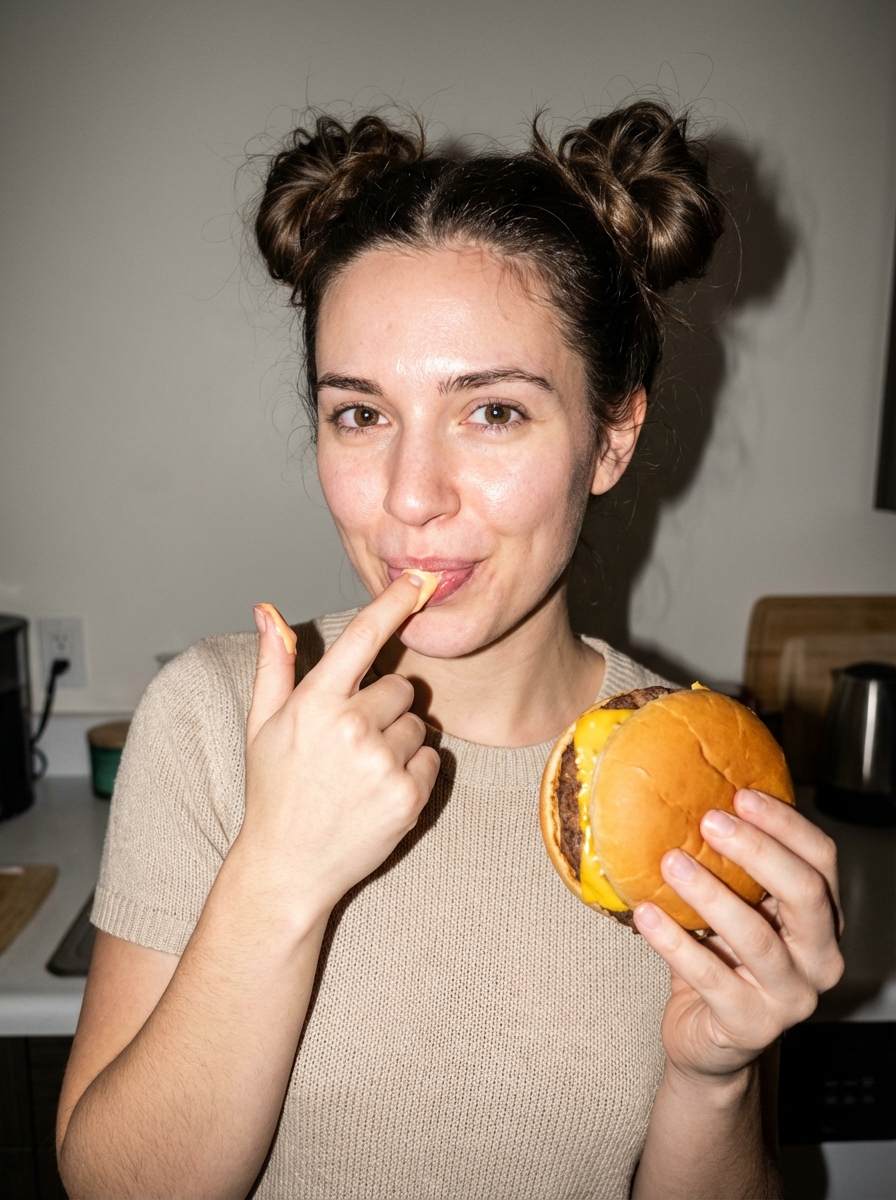 {"task": "flash_ad_lifestyle_food_portrait", "output": {"type": "single_image", "resolution": "high_resolution", "realism": "high_photographic_realism", "quality": "flash_lifestyle_ad", "retouching": "very_light_texture_preserving"}, "composition": {"shot_type": "medium_close_up", "camera_angle": "eye_level", "framing": "chest_up", "crop": "vertical", "moment": "candid_but_camera_aware"}, "subject": {"gender": "model", "age_range": "early_20s", "appearance": {"face": "natural_confident_beauty", "expression": "playful_satisfied_slight_smile", "skin_texture": "real_skin_visible_pores_freckles", "makeup": "minimal_clean_skin"}, "hair": {"style": "messy_space_buns_with_loose_strands", hair, "finish": "natural_untouched"}, "body_details": {"tattoos": "none", "skin": "natural_unretouched"}}, "wardrobe": {"style": "casual_but_ad_ready", "top": "simple_knit_top_or_sweatshirt", "fit": "relaxed", "color_palette": "neutral_clean_tones", "accessories": ["simple_rings", "small_earrings"]}, "action": {"food": "cheeseburger", "interaction": "holding a cheeseburger in one hand while licking sauce off her finger", "gesture": "finger_in_mouth_mid_lick_with_visible_sauce", "emotion": "food_is_so_good_she_instinctively_licks_her_finger", "intent": "playful_not_seductive"}, "environment": {"location": "home_interior", "room": "kitchen_or_dining_area", "background": "plain_wall_or_simple_home_elements", "atmosphere": "clean_real_lived_in"}, "lighting": {"type": "direct_on_camera_flash", "style": "point_and_shoot_flash_photography", "quality": "hard_crisp_light", "contrast": "high", "shadow_behavior": "sharp_defined_shadows_behind_subject", "flash_effects": ["slight_skin_shine", "specular_highlights", "bright_foreground_dark_background"]}, "camera": {"camera_woman": "smartphone_with_flash", "lens_equivalent": "26mm", "depth_of_field": "deep_everything_in_focus", "focus": "face_and_hand_with_sauce", "aesthetic": "modern_food_ad_snapshot"}, "color_grading": {"style": "flash_ad_clean", "temperature": "neutral", "saturation": "slightly_punchy", "contrast": "crisp_not_cinematic"}, "negative_prompts": ["seductive_pose", "sexualized_expression", "editorial_soft_light", "cinematic_lighting", "beauty_retouch", "glossy_skin", "dslr_bokeh", "fashion_catalog_pose"]}
