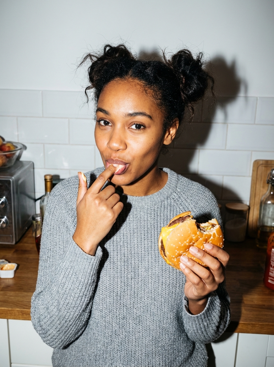 {"task": "flash_ad_lifestyle_food_portrait", "output": {"type": "single_image", "resolution": "high_resolution", "realism": "high_photographic_realism", "quality": "flash_lifestyle_ad", "retouching": "very_light_texture_preserving"}, "composition": {"shot_type": "medium_close_up", "camera_angle": "eye_level", "framing": "chest_up", "crop": "vertical", "moment": "candid_but_camera_aware"}, "subject": {"gender": "model", "age_range": "early_20s", "appearance": {"face": "natural_confident_beauty", "expression": "playful_satisfied_slight_smile", "skin_texture": "real_skin_visible_pores_freckles", "makeup": "minimal_clean_skin"}, "hair": {"style": "messy_space_buns_with_loose_strands", hair, "finish": "natural_untouched"}, "body_details": {"tattoos": "none", "skin": "natural_unretouched"}}, "wardrobe": {"style": "casual_but_ad_ready", "top": "simple_knit_top_or_sweatshirt", "fit": "relaxed", "color_palette": "neutral_clean_tones", "accessories": ["simple_rings", "small_earrings"]}, "action": {"food": "cheeseburger", "interaction": "holding a cheeseburger in one hand while licking sauce off her finger", "gesture": "finger_in_mouth_mid_lick_with_visible_sauce", "emotion": "food_is_so_good_she_instinctively_licks_her_finger", "intent": "playful_not_seductive"}, "environment": {"location": "home_interior", "room": "kitchen_or_dining_area", "background": "plain_wall_or_simple_home_elements", "atmosphere": "clean_real_lived_in"}, "lighting": {"type": "direct_on_camera_flash", "style": "point_and_shoot_flash_photography", "quality": "hard_crisp_light", "contrast": "high", "shadow_behavior": "sharp_defined_shadows_behind_subject", "flash_effects": ["slight_skin_shine", "specular_highlights", "bright_foreground_dark_background"]}, "camera": {"camera_woman": "smartphone_with_flash", "lens_equivalent": "26mm", "depth_of_field": "deep_everything_in_focus", "focus": "face_and_hand_with_sauce", "aesthetic": "modern_food_ad_snapshot"}, "color_grading": {"style": "flash_ad_clean", "temperature": "neutral", "saturation": "slightly_punchy", "contrast": "crisp_not_cinematic"}, "negative_prompts": ["seductive_pose", "sexualized_expression", "editorial_soft_light", "cinematic_lighting", "beauty_retouch", "glossy_skin", "dslr_bokeh", "fashion_catalog_pose"]}