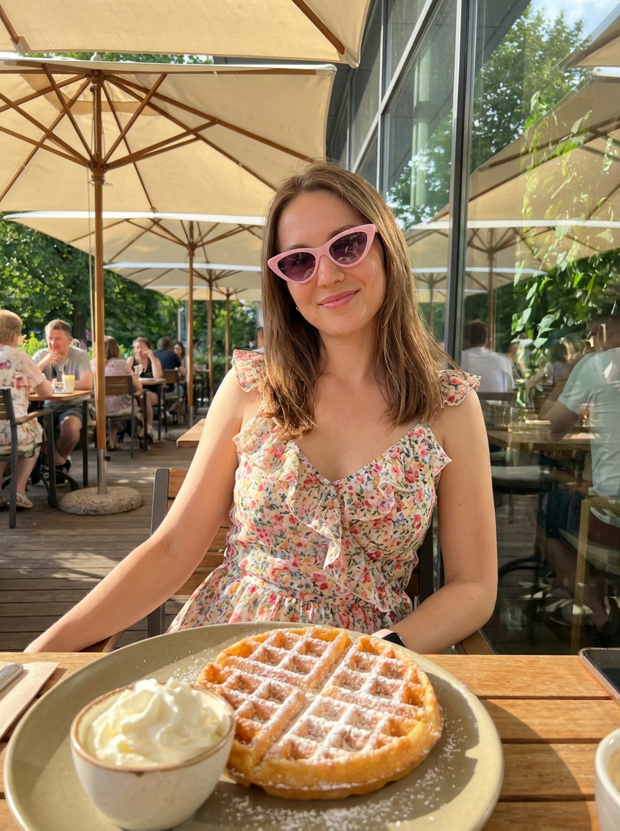 {"task": "image_generation", "output": {"aspect_ratio": "9:16", "resolution": "8K", "style": ["ultra-realistic", "photorealistic", "high-detail", "natural luxury"]}, "identity_reference": {"use_uploaded_image_as_reference": true, "face_preservation": "exact", "body_preservation": "exact", "notes": "Maintain the same face, skin tone, facial proportions, and overall body structure from the reference image. No identity change."}, "prompt": {"scene": "Sunny upscale outdoor cafe terrace during a relaxed summer brunch.", "subject": {"description": "A glamorous young model with long dark wavy hair, wearing pink-tinted cat-eye sunglasses, seated at an outdoor cafe table.", "outfit": "Romantic floral ruffled sundress with sweetheart neckline, soft pastel tones.", "expression_pose": "Relaxed confident smile, elegant casual posture, body slightly angled toward the camera."}, "foreground_food": {"description": "A large golden waffle dusted with powdered sugar on a matte plate, with a clear glass bowl of whipped cream beside it.", "composition": "Food placed close to the camera for depth, subject in mid-ground."}, "environment": {"details": ["Cream-colored umbrellas", "Natural wooden chairs", "Glass windows reflecting greenery", "Soft background crowd blur"], "mood": "Bright, luxurious, calm summer brunch vibe."}, "lighting": {"type": "Natural sunlight", "quality": "Warm tones, soft shadows, gentle highlights on sunglasses and glass."}, "camera": {"shot_type": "Candid lifestyle portrait", "framing": "Vertical portrait, subject centered", "lens_effect": "Shallow depth of field, creamy bokeh background"}, "quality_tags": ["ultra sharp", "HDR", "realistic skin texture", "fine fabric details", "natural color grading", "cinematic depth"]}, "negative_prompt": ["cartoon", "anime", "cgi", "3d render", "painting", "blur", "low resolution", "overexposed", "underexposed", "bad anatomy", "extra fingers", "deformed hands", "face distortion", "different identity", "duplicate face", "text", "logo", "watermark", "oversaturated colors"]}