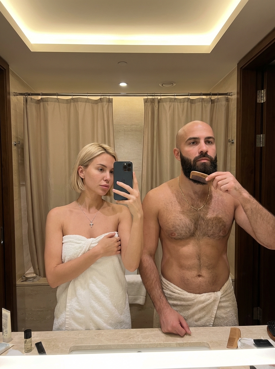 {"task": "ultra_photorealistic_mirror_selfie", "output": {"type": "single_image", "resolution": "ultra_high_resolution", "realism_level": "indistinguishable_from_reality", "skin_rendering": "natural_enhanced_texture", "avoid_ai_look": true}, "scene": {"location": "modern hotel bathroom", "environment_details": {"mirror": "large rectangular wall-mounted mirror", "curtains": "beige fabric shower curtains", "countertop": "light stone bathroom counter", "lighting": "warm overhead bathroom lighting, evenly diffused"}, "atmosphere": "intimate, casual, real-life moment"}, "composition": {"shot_type": "mirror_selfie", "framing": "medium-wide", "crop": "vertical", "camera_height": "eye_level", "perspective": "straight-on reflection", "symmetry": "natural, slightly imperfect"}, "subjects": [{"role": "female_subject", "position": "left_side_of_frame", "appearance": {"age_range": "mid_20s", "body_type": "slim", "skin": "smooth realistic skin texture with visible pores", "hair": "short blonde bob, natural styling", "expression": "relaxed, neutral, slightly posed"}, "clothing": {"outfit": "bath towel wrapped around body", "accessories": ["silver cross necklace"]}, "action": "holding smartphone and taking mirror selfie", "phone": {"type": "modern smartphone", hair, "reflection_accuracy": "true_to_life"}}, {"role": "male_subject", "position": "right_side_of_frame", "appearance": {"age_range": "late_20s", "body_type": "athletic, muscular", "skin": "highly detailed skin texture with natural highlights", "facial_hair": "full dark beard", "hair": "shaved head", "expression": "focused, casual"}, "clothing": {"outfit": "bath towel wrapped around waist", "accessories": ["gold chain necklace"]}, "action": "brushing beard with wooden beard comb"}], "camera": {"device_style": "iphone_photography", "lens": "standard wide lens", "focal_length_equivalent": "26mm", "depth_of_field": "natural smartphone depth", "focus": "sharp on subjects, realistic micro-blur in background"}, "lighting": {"source": "bathroom ceiling lights", "quality": "soft but realistic", "skin_interaction": "natural specular highlights, no plastic shine", "shadow_behavior": "subtle and physically accurate"}, "color_grading": {"style": "neutral_warm", "contrast": "realistic", "saturation": "true_to_life", "white_balance": "warm indoor"}, "texture_detailing": {"skin": "visible pores, fine lines, natural imperfections", "fabric": "realistic towel fibers and folds", "mirror": "accurate reflections, no distortion"}, "negative_prompt": ["over-smoothing skin", "plastic skin", "AI uncanny face", "exaggerated muscles", "over-sharpening", "cinematic lighting", "fashion editorial look", "studio lighting", "blurred facial details", "fake reflections"]}