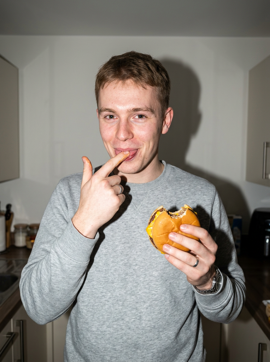 {"task":"flash_ad_lifestyle_food_portrait","output":{"type":"single_image","resolution":"high_resolution","realism":"high_photographic_realism","quality":"flash_lifestyle_ad","retouching":"very_light_texture_preserving"},"composition":{"shot_type":"medium_close_up","camera_angle":"eye_level","framing":"chest_up","crop":"vertical","moment":"candid_but_camera_aware"},"subject":{"gender":"male_man","age_range":"early_20s","appearance":{"face":"natural_confident_handsome","expression":"playful_satisfied_slight_smile","skin_texture":"real_skin_visible_pores_freckles","makeup":"clean_groomed_skin_light_stubble"},"hair":{"style":"short_tousled_textured_cut_with_loose_strands","finish":"natural_untouched"},"body_details":{"tattoos":"none","skin":"natural_unretouched"}},"wardrobe":{"style":"casual_but_ad_ready","top":"simple_crewneck_sweatshirt_or_henley","fit":"relaxed","color_palette":"neutral_clean_tones","accessories":["simple_rings","simple_watch"]},"action":{"food":"cheeseburger","interaction":"holding a cheeseburger in one hand while sauce off his finger","gesture":"finger_in_mouth_mid_lick_with_visible_sauce","emotion":"food_is_so_good_he_instinctively_licks_his_finger","intent":"playful_not_seductive"},"environment":{"location":"home_interior","room":"kitchen_or_dining_area","background":"plain_wall_or_simple_home_elements","atmosphere":"clean_real_lived_in"},"lighting":{"type":"direct_on_camera_flash","style":"point_and_shoot_flash_photography","quality":"hard_crisp_light","contrast":"high","shadow_behavior":"sharp_defined_shadows_behind_subject","flash_effects":["slight_skin_shine","specular_highlights","bright_foreground_dark_background"]},"camera":{"camera_man":"smartphone_with_flash","lens_equivalent":"26mm","depth_of_field":"deep_everything_in_focus","focus":"face_and_hand_with_sauce","aesthetic":"modern_food_ad_snapshot"},"color_grading":{"style":"flash_ad_clean","temperature":"neutral","saturation":"slightly_punchy","contrast":"crisp_not_cinematic"},"negative_prompts":["seductive_pose","sexualized_expression","editorial_soft_light","cinematic_lighting","beauty_retouch","glossy_skin","dslr_bokeh","fashion_catalog_pose"]}