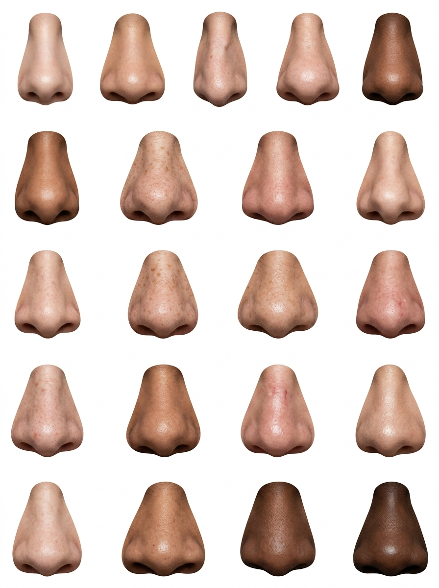 {"task":"photorealistic_anatomical_reference_sheet","output":{"type":"single_image","aspect_ratio":"4:5","resolution":"ultra_high_resolution_8k","quality":"extreme_photorealism"},"scene":{"background":"pure white seamless background","layout":"clean grid layout with evenly spaced nose samples","composition":"multiple isolated human noses arranged in rows, each clearly distinct from the others"},"subject":{"type":"human_noses_only","description":"wide variety of realistic human noses with no face, no eyes, no mouth, emphasizing diversity, imperfection, and contrast","variations":["small narrow refined nose","very wide flat nose","long crooked nose","broken nose with asymmetry","bulbous oversized nose","sharp hooked nose","short upturned nose","thick heavy nose with wide bridge","thin fragile-looking nose","strong masculine bridge nose","soft rounded feminine nose","aged nose with sagging tip","nose with pores and oiliness","scarred nose with healed imperfections","slightly deviated septum nose","uneven nostrils nose","compressed flattened nose","prominent nostrils nose","unattractive awkward nose","classically beautiful balanced nose"],"skin_tones":"full spectrum of natural human skin tones from very light to very dark","details":[" pores","uneven skin texture","natural freckles","subtle redness around nostrils"," scars","realistic shine and oil","accurate nostril anatomy","no cosmetic perfection"]},"lighting":{"type":"soft studio lighting","shadows":"minimal soft shadows","contrast":"neutral and balanced, no dramatic beauty lighting"},"camera":{"angle":"straight-on frontal view","lens":"macro 85mm equivalent","focus":"tack sharp focus on skin texture and structural differences"},"style":{"aesthetic":"medical reference \/ raw stock photography","editing":"no beauty retouching, no smoothing, no symmetry correction","realism_level":"hyper realistic, unfiltered"},"negative_prompt":["full face","eyes","mouth","lips","ears","makeup","beauty retouch","perfect symmetry","plastic skin","cartoon","illustration","stylized skin","blur","low resolution","artifacts","distorted anatomy"]}