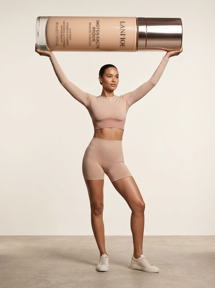 {"task":"ultra_photorealistic_enormous_cosmetic_hero_editorial","input":{"product_reference":{"description":"uploaded cosmetic product image","use_as":["exact product shape","material","branding","surface_finish"],"preserve_identity":true}},"output":{"type":"single_image","resolution":"ultra_high_resolution_8k","realism":"extreme_photorealism","quality":"luxury_cosmetic_campaign"},"subject":{"model":{"gender":"model","body_type":"athletic_feminine","pose":"relaxed standing pose, one hip shifted, arms lifted naturally with ease","movement":"soft body curve, effortless posture","expression":"confident, serene, alive","gaze":"slightly off-camera, editorial calm","hair":"long hair with natural volume and gentle motion","skin":{"texture":"highly realistic","detail":" pores and micro-texture","finish":"luminous natural glow","retouching":"enhanced skin, luxury editorial realism"}}},"wardrobe":{"style":"minimal luxury active-lifestyle","outfit":{"top":"soft fitted long-sleeve crop top ","bottom":"high-waisted seamless shorts","color_palette":"neutral and blush tones matching the cosmetic","material":"premium matte fabric with subtle sheen"},"footwear":"clean minimalist trainers"},"product_interaction":{"replacement_object":"cosmetic product replaces the barbell","scale":"enormous, monument-scale hero product","relative_size":"product length spans wider than the model\u2019s shoulders, caps appear massive","positioning":"held above head with relaxed arms, product slightly angled","weight_behavior":"arms show gentle stretch but no strain, believable balance","integration":"product casts realistic shadow on model and background","surface_detail":"ultra-sharp branding, realistic reflections, micro scratches and gloss variation"},"scene":{"environment":{"location":"minimal high-end studio","background":"warm off-seamless wall","floor":"soft muted texture, neutral tone"},"composition":{"framing":"full body portrait with generous negative space","hierarchy":"product dominates first read, model supports hero","flow":"smooth vertical movement from model to product","balance":"soft asymmetry to avoid stiffness"}},"lighting":{"style":"luxury cosmetic studio lighting","key_light":"large diffused softbox","fill_light":"very subtle for depth","accent_light":"gentle highlights to emphasize product edges","shadow_quality":"soft grounded shadows for realism"},"camera":{"lens":"85mm","aperture":"f\/3.2","depth_of_field":"controlled shallow focus","perspective":"slightly low angle to enhance monumentality"},"aesthetic":{"mood":"iconic, confident, modern","style":"high-fashion cosmetic hero shot","color_grading":"soft blush warmth, neutral highlights","finish":"photorealistic, campaign-ready, no CGI feel"},"negative_prompts":["cartoon scale","floating product","cgi plastic look","unrealistic physics","stiff body","over-flexed muscles","blurred logo","harsh shadows","low detail"]}