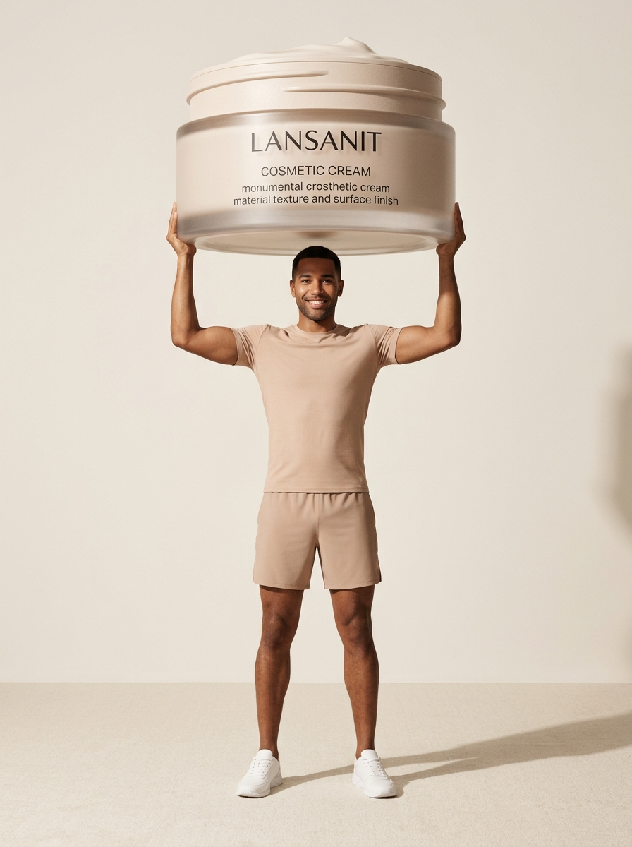 {"task":"ultra_photorealistic_enormous_cosmetic_hero_editorial","input":{"product_reference":{"description":"uploaded cosmetic product image","use_as":["exact product shape","material","branding","surface_finish"],"preserve_identity":true}},"output":{"type":"single_image","resolution":"ultra_high_resolution_8k","realism":"extreme_photorealism","quality":"luxury_cosmetic_campaign"},"subject":{"model":{"gender":"male","body_type":"athletic_muscular","pose":"relaxed standing pose, weight shifted to one leg, arms lifted naturally with confidence","movement":"defined muscular lines, effortless posture","expression":"confident, serene, alive","gaze":"slightly off-camera, editorial calm","hair":"short styled hair natural volume and gentle motion","skin":{"texture":"highly realistic","detail":" pores and micro-texture, light stubble","finish":"luminous natural glow","retouching":"enhanced skin, luxury editorial realism"}}},"wardrobe":{"style":"minimal luxury active-lifestyle","outfit":{"top":"soft fitted long-sleeve fitted t-shirt","bottom":"seamless athletic shorts","color_palette":"neutral and blush tones matching the cosmetic","material":"premium matte fabric with subtle sheen"},"footwear":"clean minimalist trainers"},"product_interaction":{"replacement_object":"cosmetic product replaces the barbell","scale":"enormous, monument-scale hero product","relative_size":"product length spans wider than the model\u2019s shoulders, caps appear massive","positioning":"held above head with relaxed arms, product slightly angled","weight_behavior":"arms show gentle stretch but no strain, believable balance","integration":"product casts realistic shadow on model and background","surface_detail":"ultra-sharp branding, realistic reflections, micro scratches and gloss variation"},"scene":{"environment":{"location":"minimal high-end studio","background":"warm off-seamless wall","floor":"soft muted texture, neutral tone"},"composition":{"framing":"full body portrait with generous negative space","hierarchy":"product dominates first read, model supports hero","flow":"smooth vertical movement from model to product","balance":"soft asymmetry to avoid stiffness"}},"lighting":{"style":"luxury cosmetic studio lighting","key_light":"large diffused softbox","fill_light":"very subtle for depth","accent_light":"gentle highlights to emphasize product edges","shadow_quality":"soft grounded shadows for realism"},"camera":{"lens":"85mm","aperture":"f\/3.2","depth_of_field":"controlled shallow focus","perspective":"slightly low angle to enhance monumentality"},"aesthetic":{"mood":"iconic, confident, modern","style":"high-fashion cosmetic hero shot","color_grading":"soft blush warmth, neutral highlights","finish":"photorealistic, campaign-ready, no CGI feel"},"negative_prompts":["cartoon scale","floating product","cgi plastic look","unrealistic physics","stiff body","over-flexed muscles","blurred logo","harsh shadows","low detail"]}