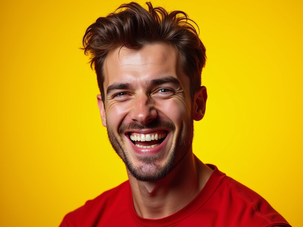 the image is a vibrant and colorful thumbnail, typically used for a youtube video. model with evil grin and mischievous look, bright plain gold background
