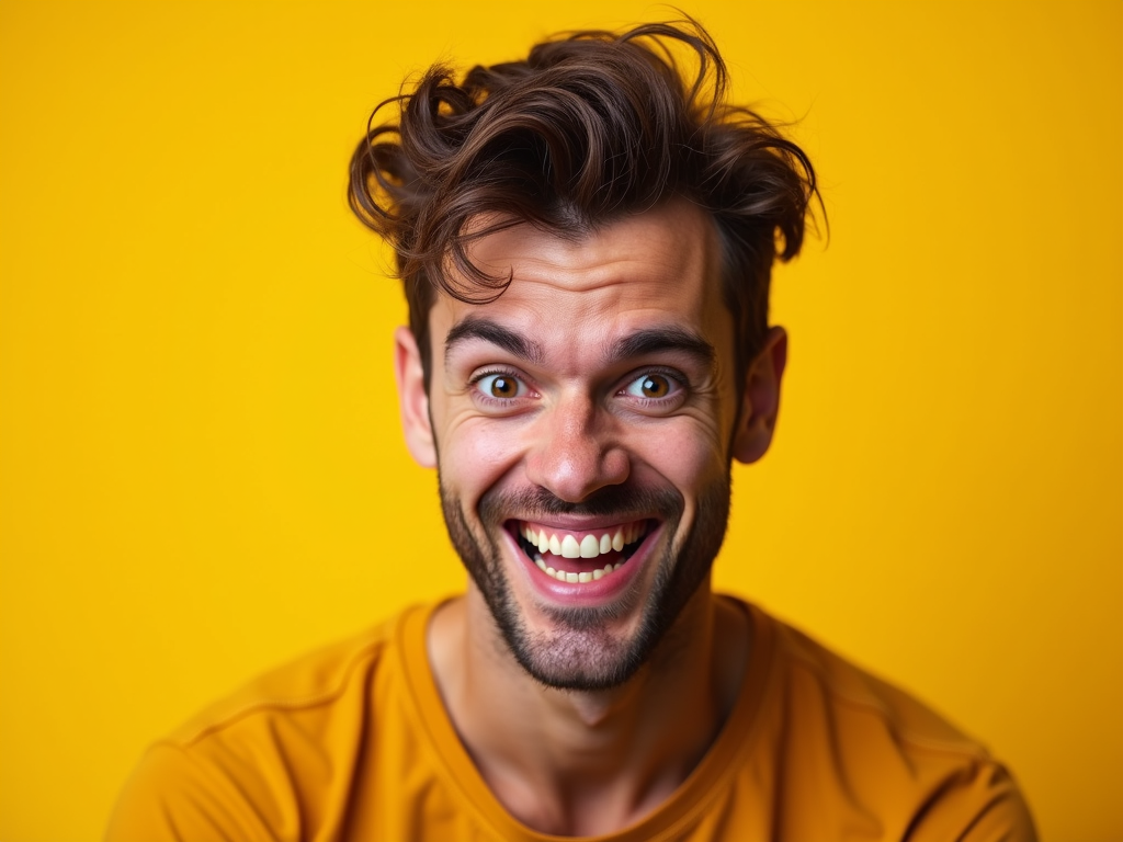 the image is a vibrant and colorful thumbnail, typically used for a youtube video. model with evil grin and mischievous look, bright plain gold background