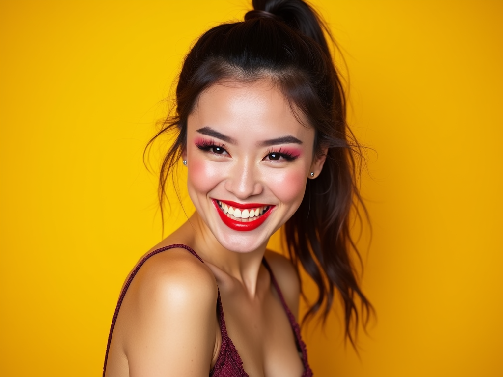 the image is a vibrant and colorful thumbnail, typically used for a youtube video. model with evil grin and mischievous look, bright plain gold background