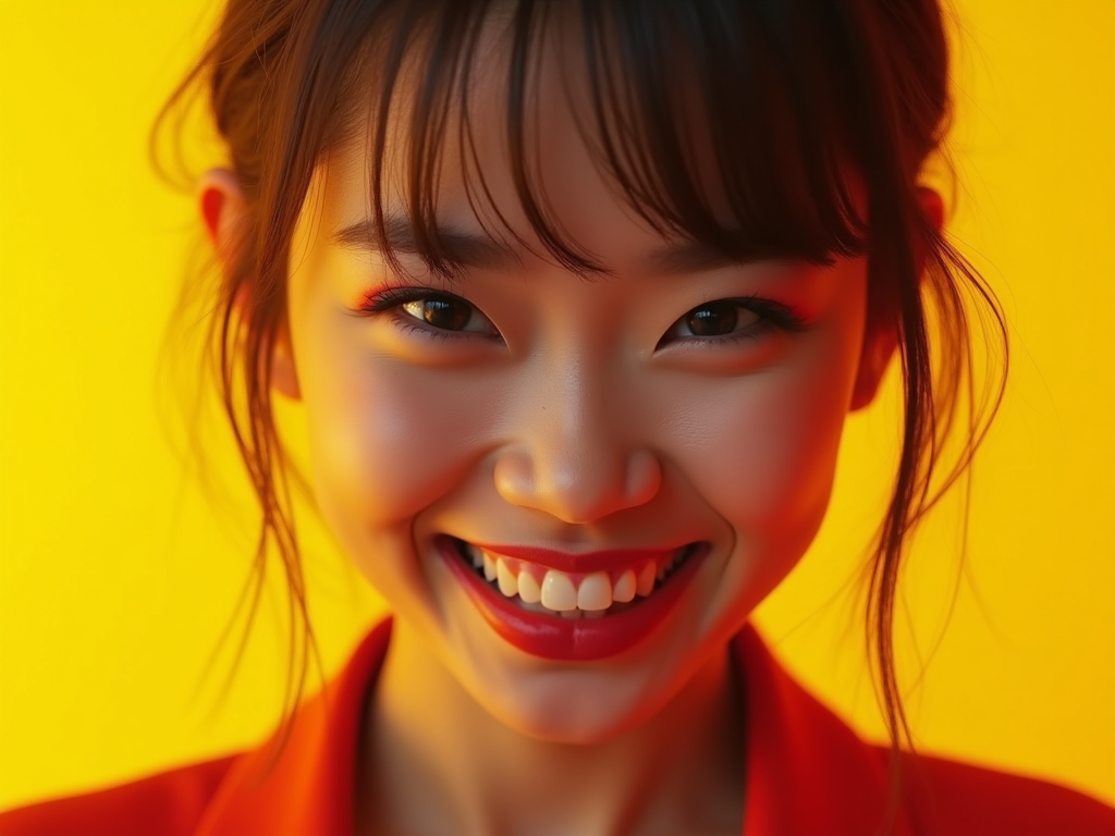 the image is a vibrant and colorful thumbnail, typically used for a youtube video. model with evil grin and mischievous look, bright plain gold background