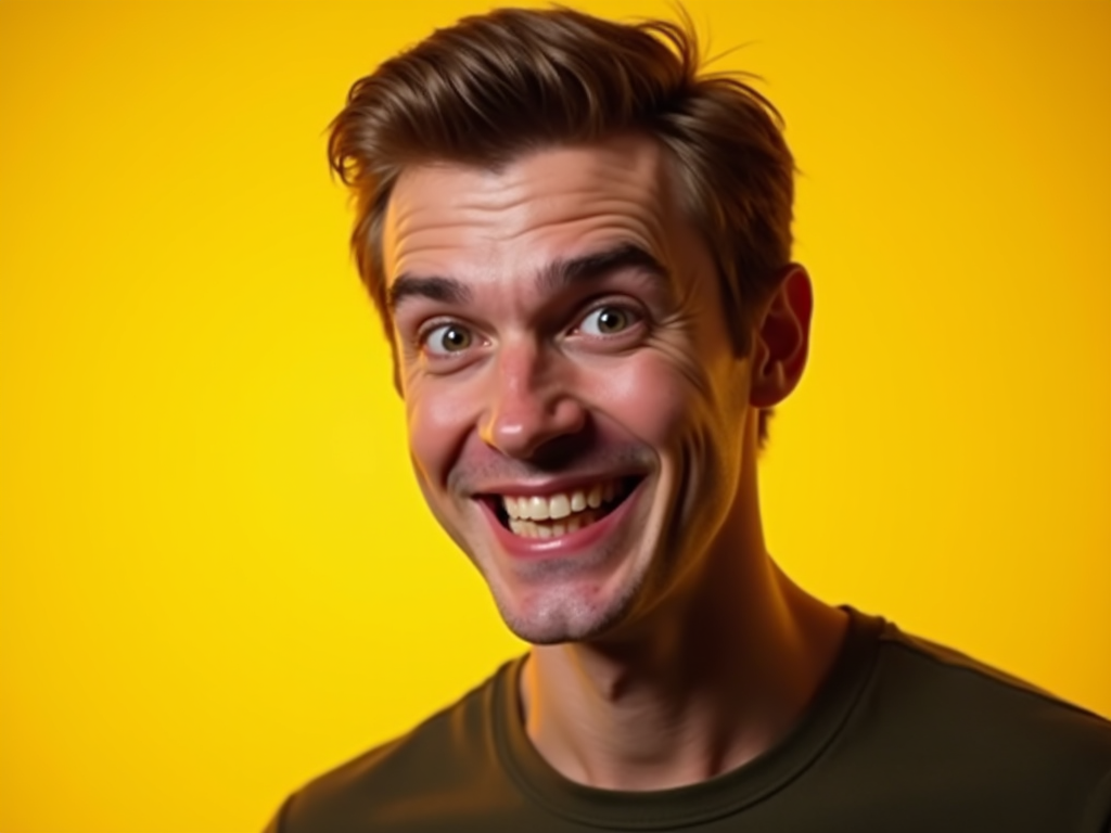 the image is a vibrant and colorful thumbnail, typically used for a youtube video. model with evil grin and mischievous look, bright plain gold background