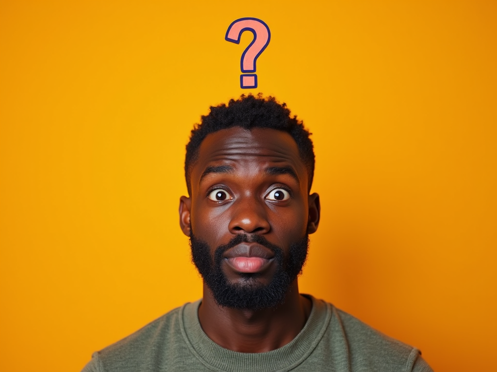 the image is a vibrant and colorful thumbnail, typically used for a youtube video. model with confused puzzled expression, question mark above head, bright plain brown background