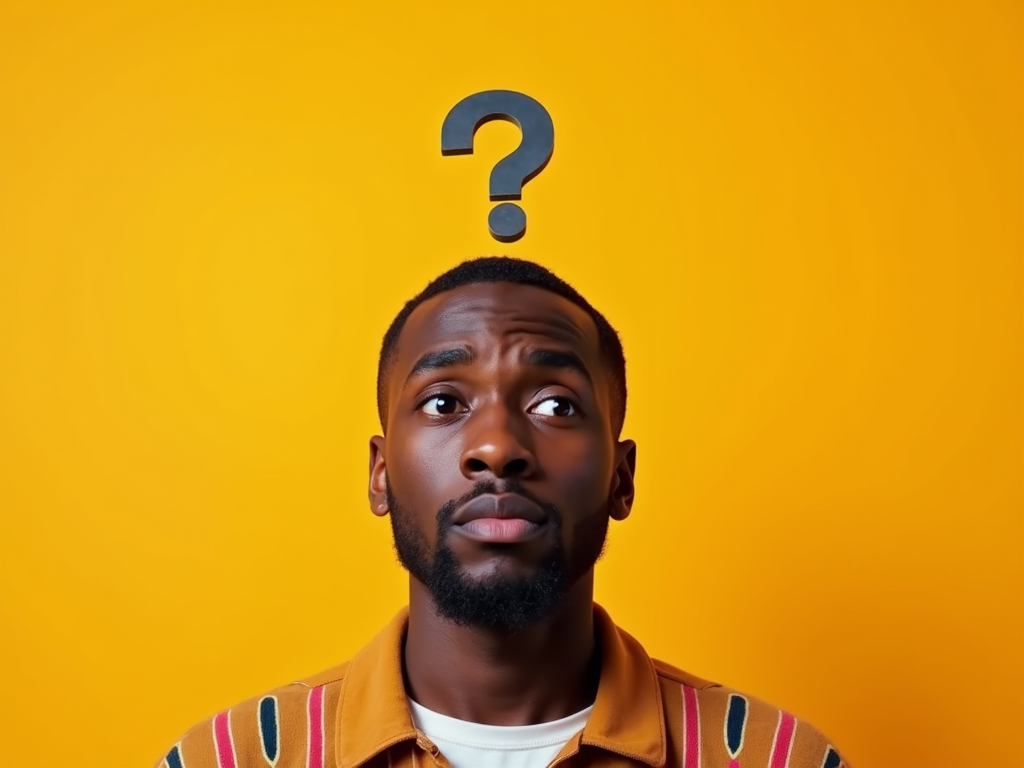 the image is a vibrant and colorful thumbnail, typically used for a youtube video. model with confused puzzled expression, question mark above head, bright plain brown background
