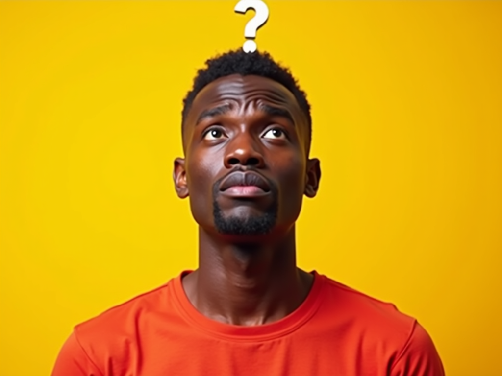 the image is a vibrant and colorful thumbnail, typically used for a youtube video. model with confused puzzled expression, question mark above head, bright plain brown background