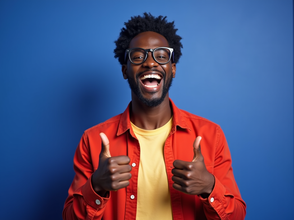 the image is a vibrant and colorful thumbnail, typically used for a youtube video. model with wide smile and thumbs up, positive reaction, bright plain indigo background
