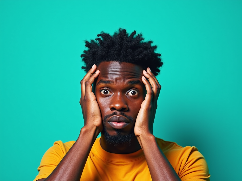 the image is a vibrant and colorful thumbnail, typically used for a youtube video. model with hands on head, disbelief expression, bright plain teal background