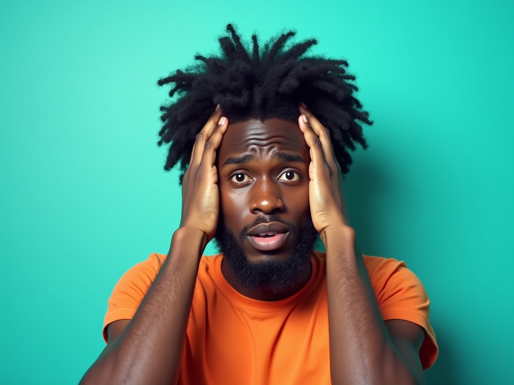 the image is a vibrant and colorful thumbnail, typically used for a youtube video. model with hands on head, disbelief expression, bright plain teal background