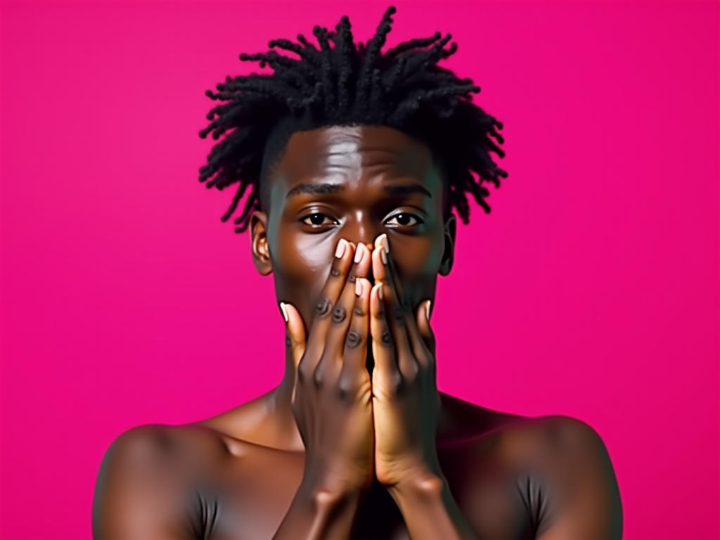the image is a vibrant and colorful thumbnail, typically used for a youtube video. model with hands covering mouth in shock, bright plain magenta background
