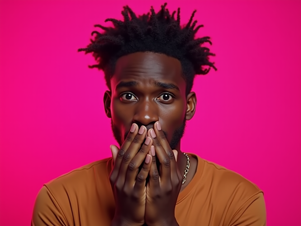 the image is a vibrant and colorful thumbnail, typically used for a youtube video. model with hands covering mouth in shock, bright plain magenta background