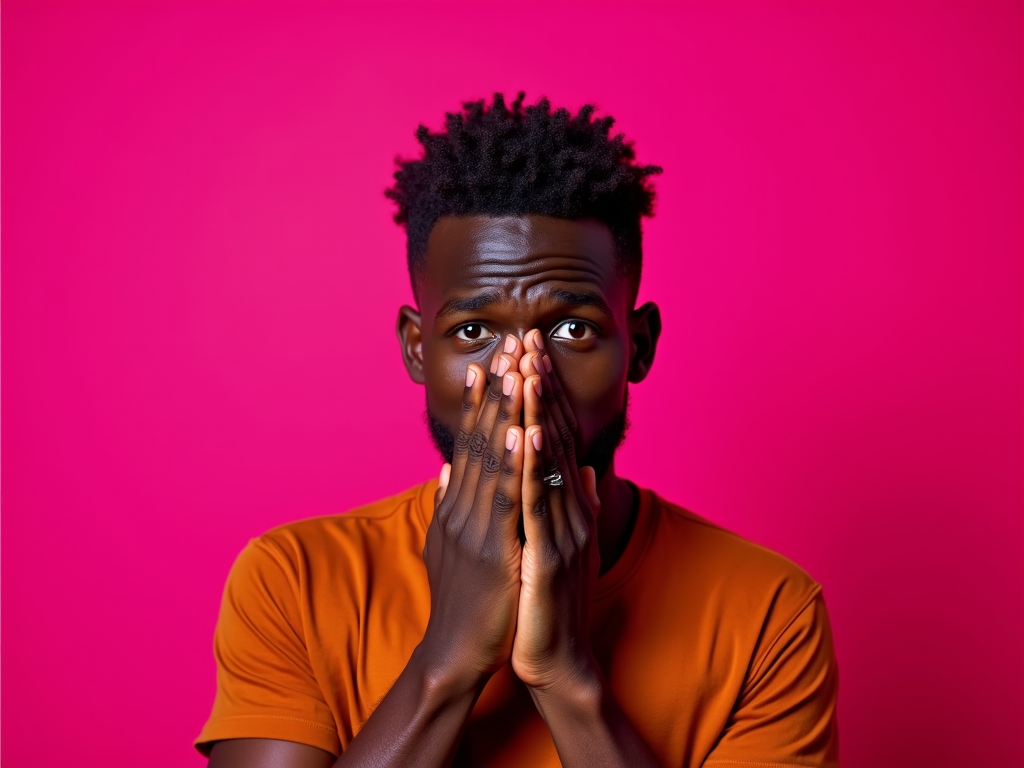 the image is a vibrant and colorful thumbnail, typically used for a youtube video. model with hands covering mouth in shock, bright plain magenta background
